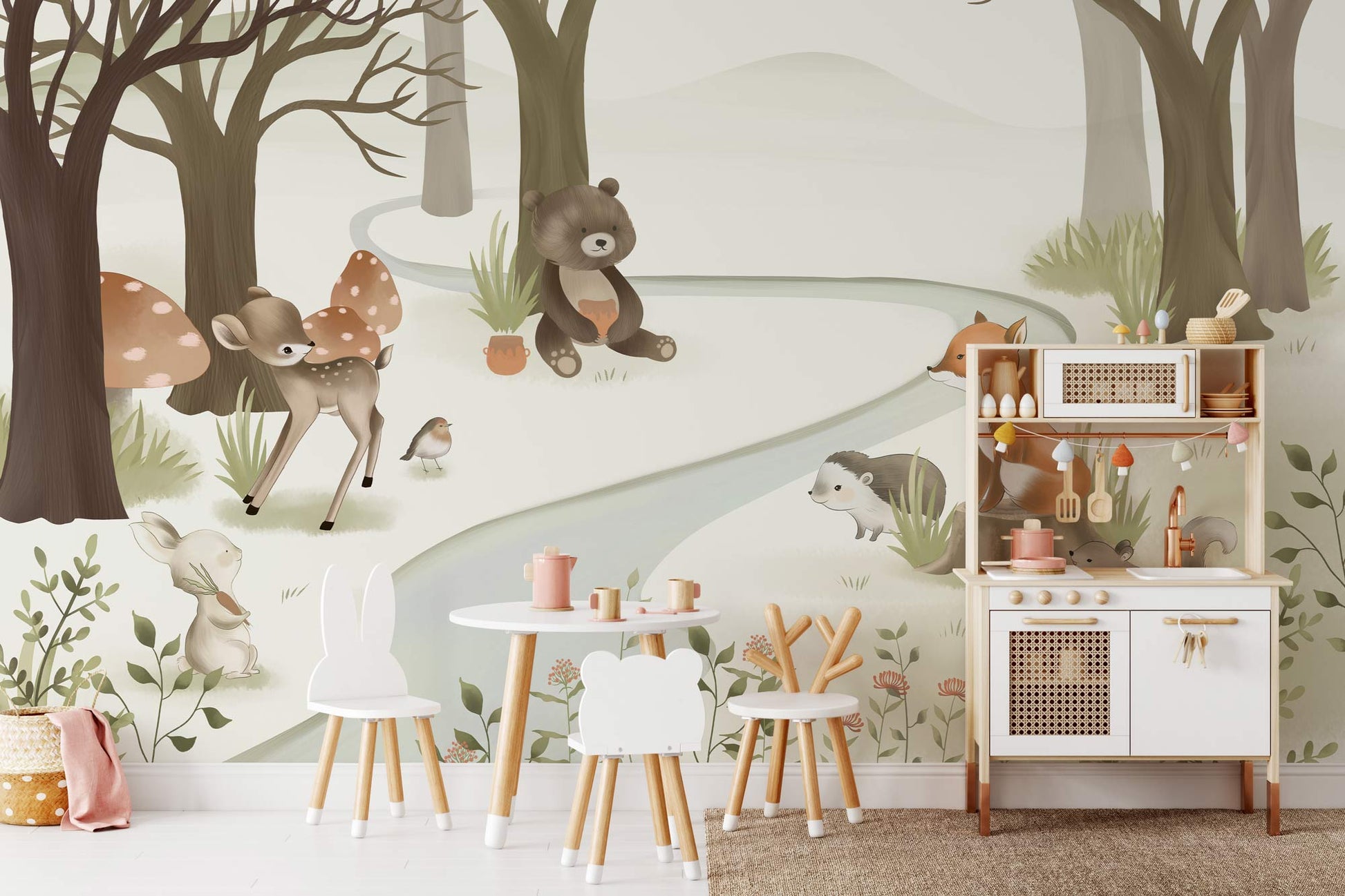 Easily bring a breathtaking forest animal theme to a children's bedroom or nursery with our water colour Fauna wallpaper, full of cute forest critters and natural colours. This mural is a hand-painted design featuring some of the adorable animals found in forests, such as bear, deer and fox. Little ones will be amazed with this wildlife scene as a feature wall in their room. Bring out the curious side of your kids with a nature-filled wall design that they¡¯ll cherish while they grow.