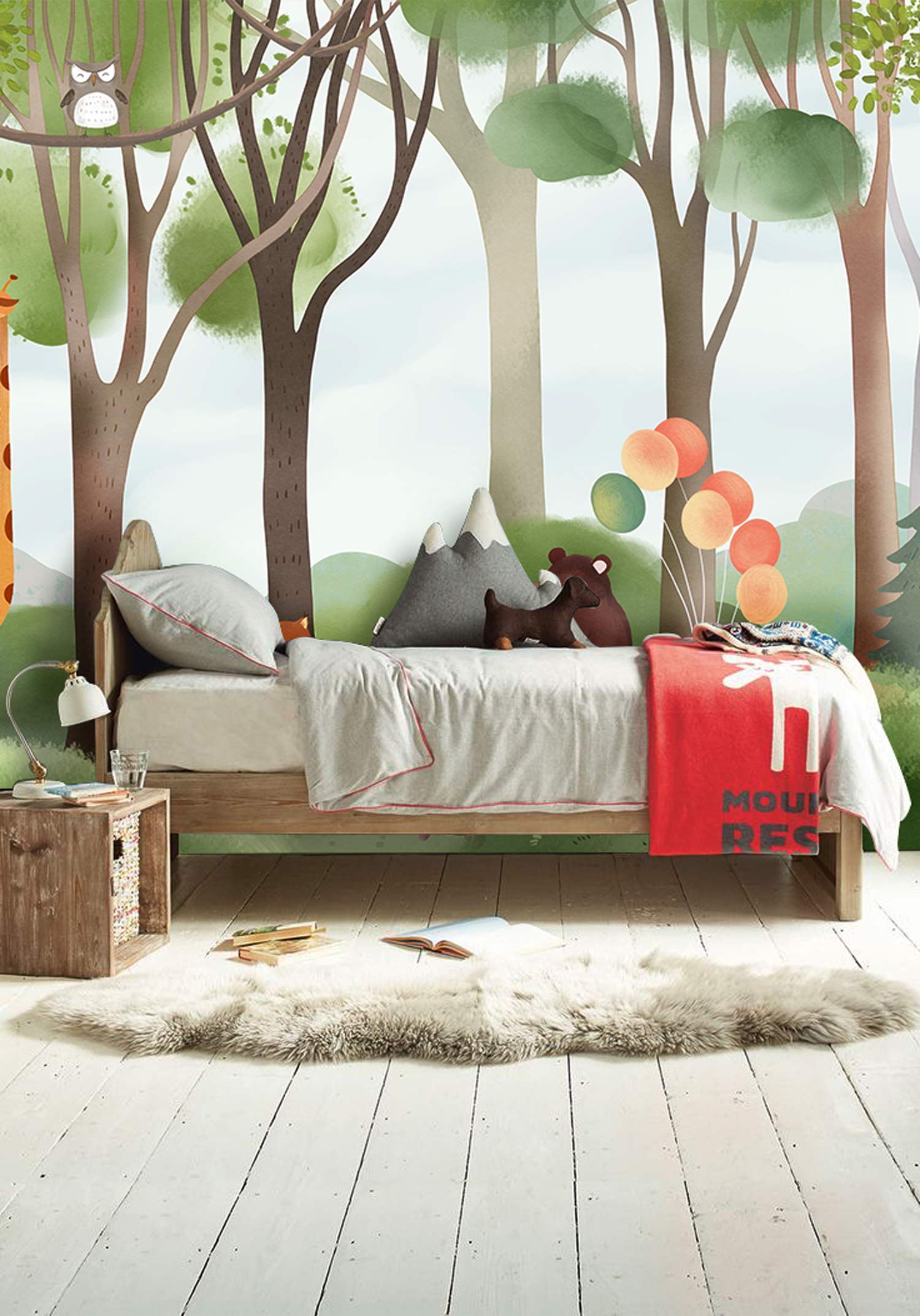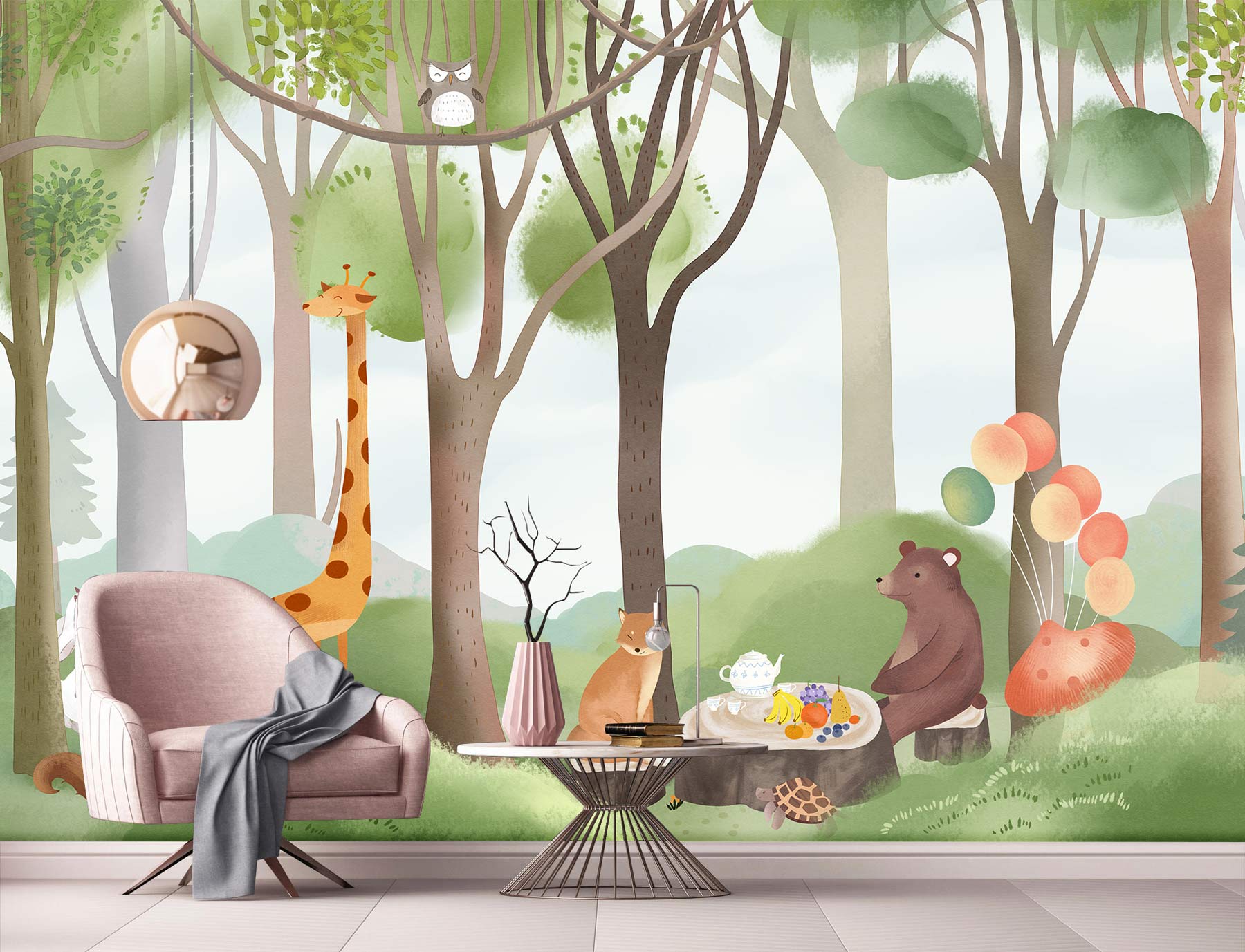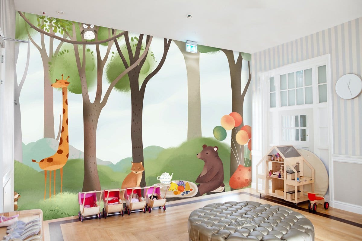 If you are looking for a cute forest Wall Murals for your kid's room, here is a great one for you. This beautiful painting of animals having a wonderful picnic in the peaceful green forest designed in soft pastal tones will be perfect for your child's bedroom and playroom. Interesting rendering with a natural atmosphere and a refreshing wall decoration perfect for your kids.