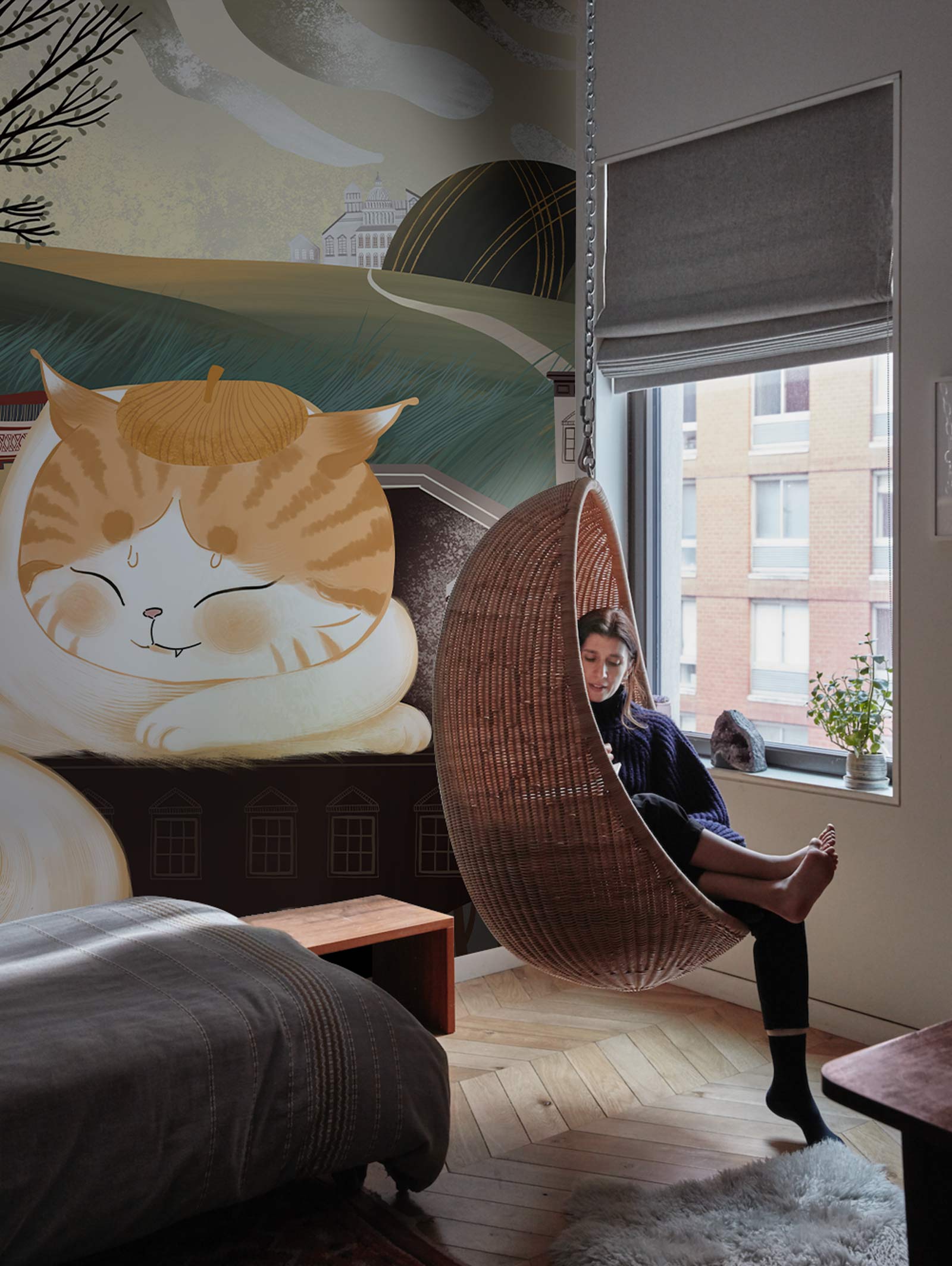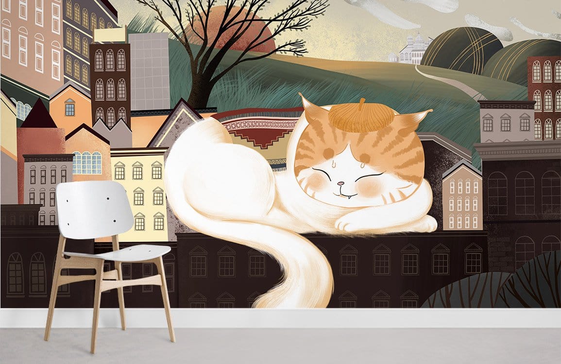 Take a look at this cute cartoon cat taking a nap. Painted with colouful colours that will be perfect for your child¡¯s bedroom or playroom. Place this adorable cat wallpaper on the wall that is next to their bed and enjoy the colourful and lively feeling it brings to you.