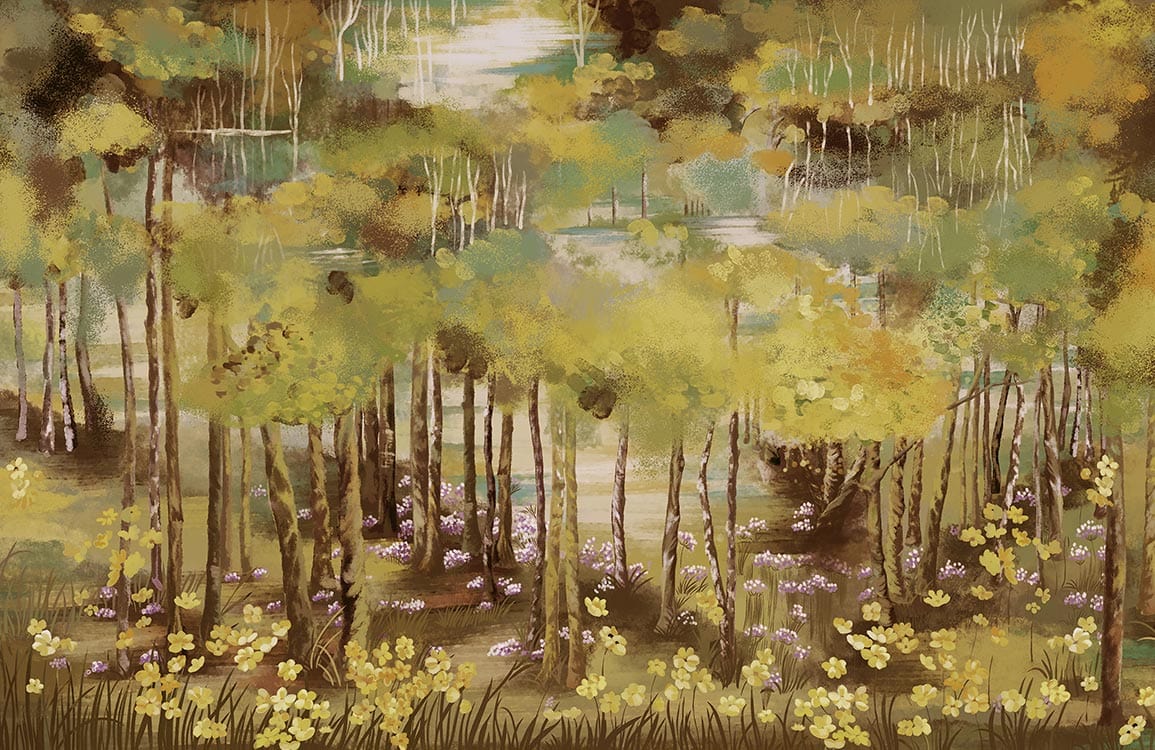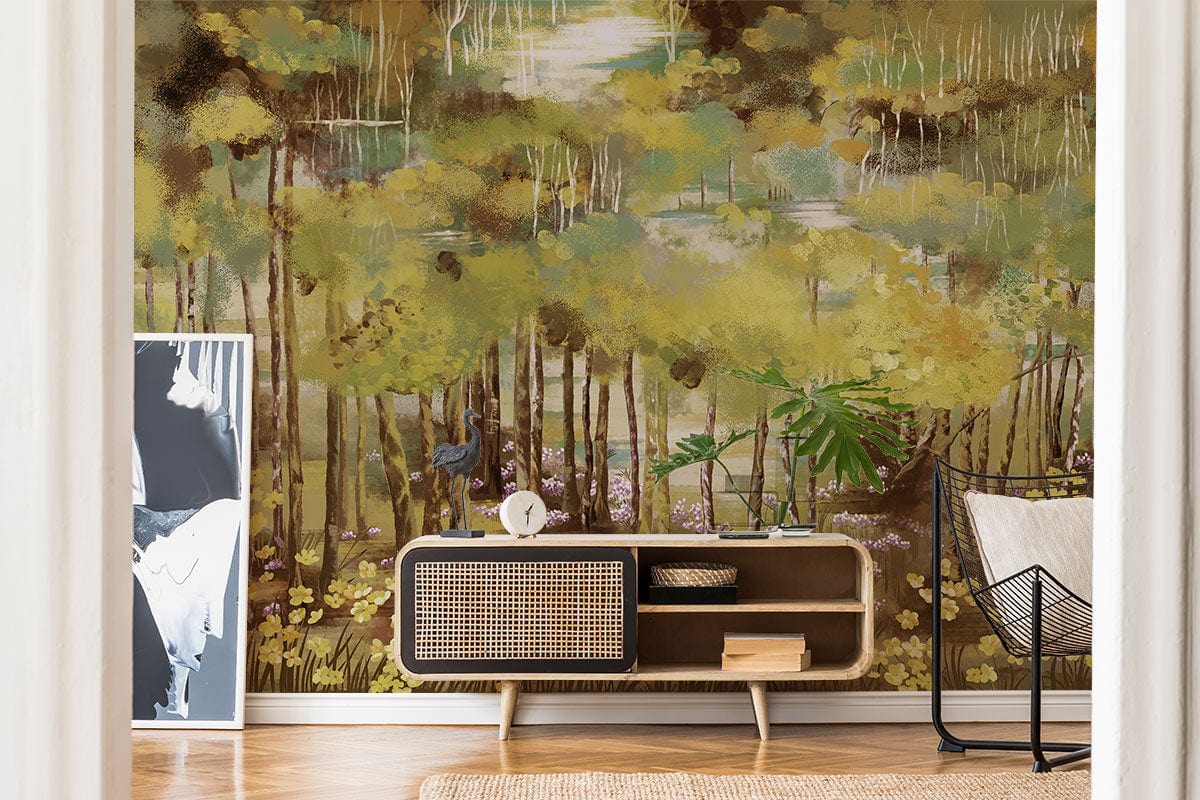 Fall is here, and this Autumn Forest Wall Murals brings the season to life. Featuring a warm dark red tone and vibrant autumn leaves, this forest jungle wallpaper brings the colours of fall inside your house. The print's lush background and striking design will accentuate any room of your home in style. This art deco wallpaper is ideal for a living room, bedroom, or hallway accent wall to provide a soft, welcoming, and calming ambiance.