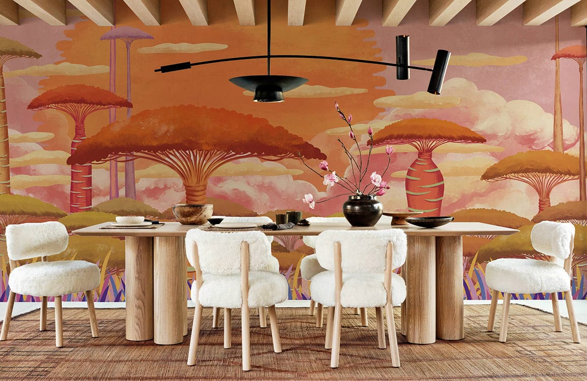 An energetic, cheery, warm blend of orange, pink, and green is tucked away on a blushing pink background in this natural landscape Wall Murals. This wallpaper's theme combines the majestic baobab tree's dynamic beauty and the setting sun's enthusiasm. While reflecting the romance and mystery surrounding this landscape setting and fostering a peaceful ambiance in your living area, this beautiful Baobab and Sunset Clouds Wall Murals provides a fantastic focal point or backdrop for whatever place you choose to design.