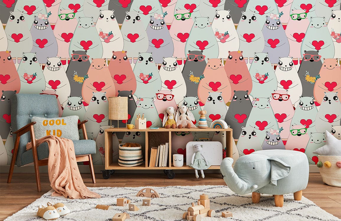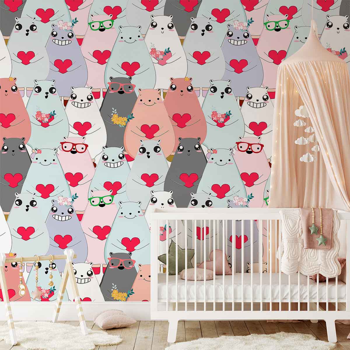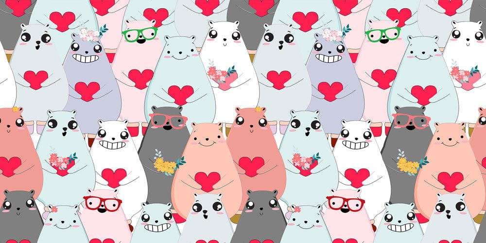 Bring home a timeless piece of art that shows your love for your little ones. This Bears Show Love Wall Murals features cute cartoon bears with big lovely eyes and holding hearts and flowers, as if it's showing their love for you! Perfect for kids' rooms, nurseries, and playrooms, this nursery wallpaper will put a smile on everyone's face and add some charm and character to your house. This mural is easy to install and comes in a variety of colours, so you can coordinate it with any decor.