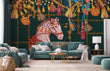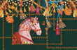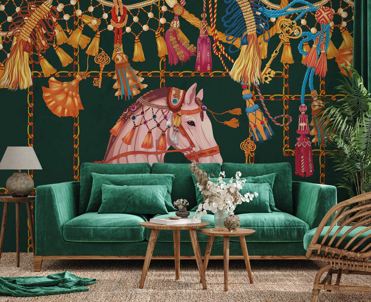 This wallpaper is a hand-painted design featuring beautiful pink horse and tassels decoration under dark green backdrop. You will be amazed with this scene as a feature wall in your living room, bedroom, dining room and hallway. Works perfectly with either traditional or modern style home decors and furniture.