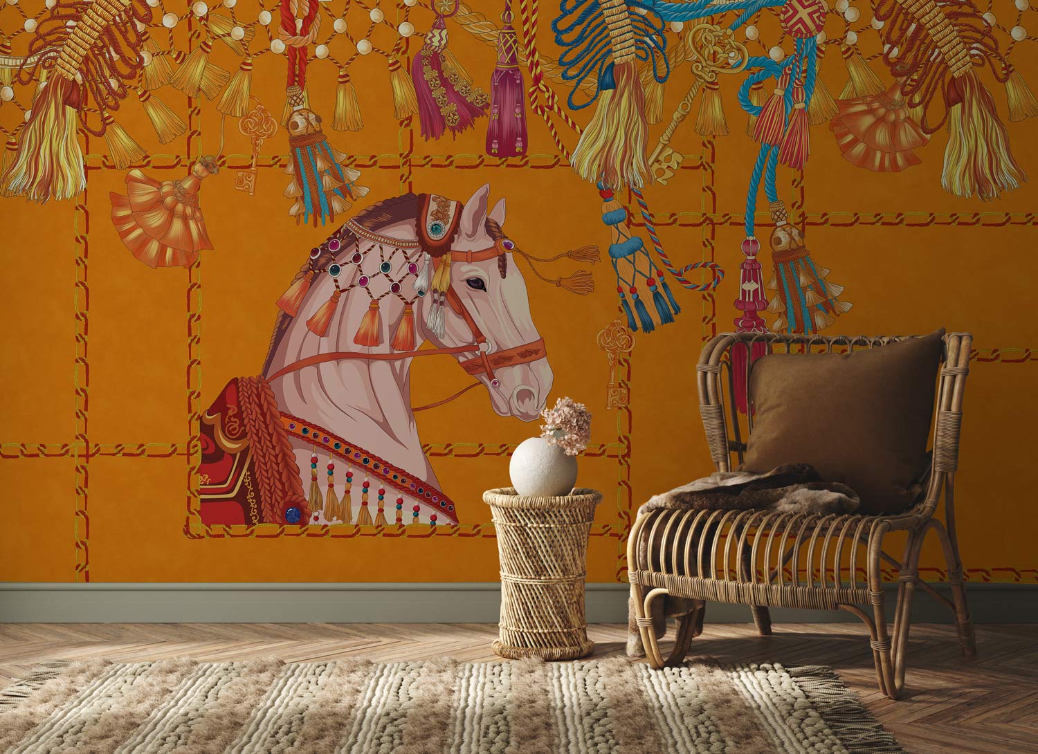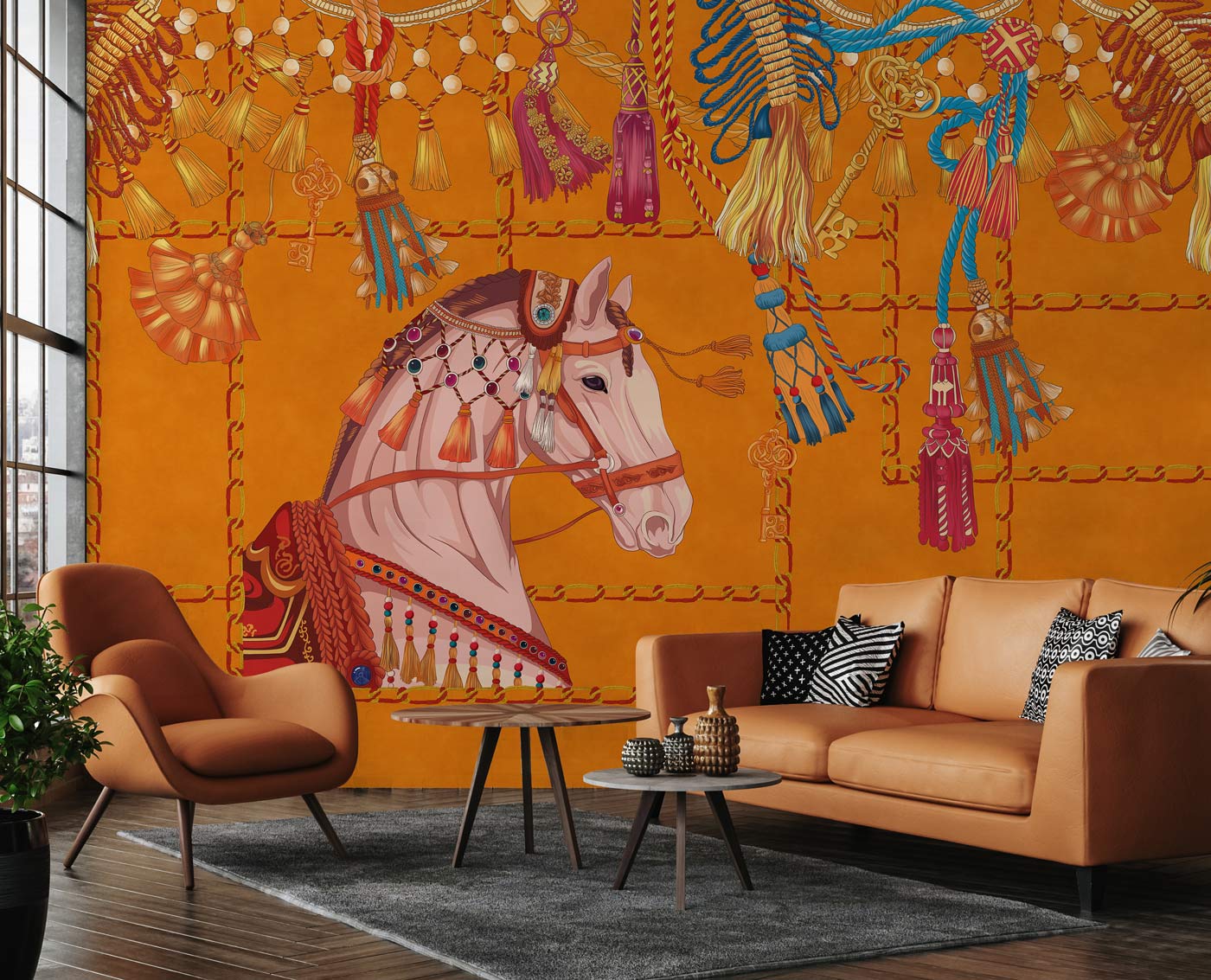 This wallpaper is a hand-painted design featuring beautiful pink horse and tassels decoration under orange backdrop. You will be amazed with this scene as a feature wall in your living room, bedroom, dining room and hallway. Works perfectly with either traditional or modern style home decors and furniture.