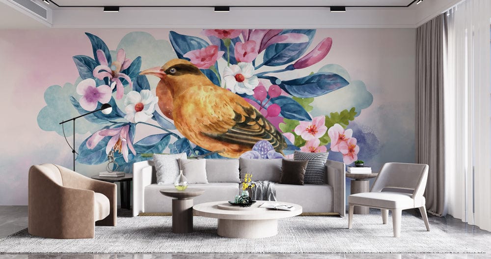 Enjoy the naturalistic beauty of our Bird in Flower Wall Murals. This mural features a brown bird perched on the middle of purple and white flowers, creating an understated yet charming look for your walls. This design is ideal for brightening up your living room, bedroom, or any other space in your home while flaunting an interesting vintage, hand-painted look that is great for floral-themed interiors and delicate glass furnishings.
