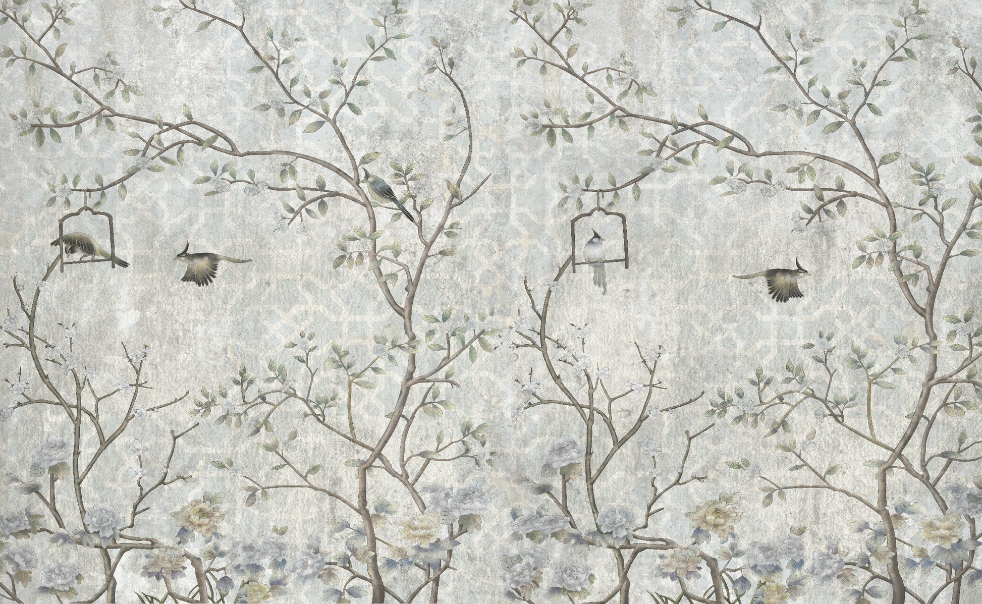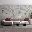 Transform your space into a captivating sanctuary with our stunning 3D wallpaper design featuring birds and branches set against a grunge grey background.