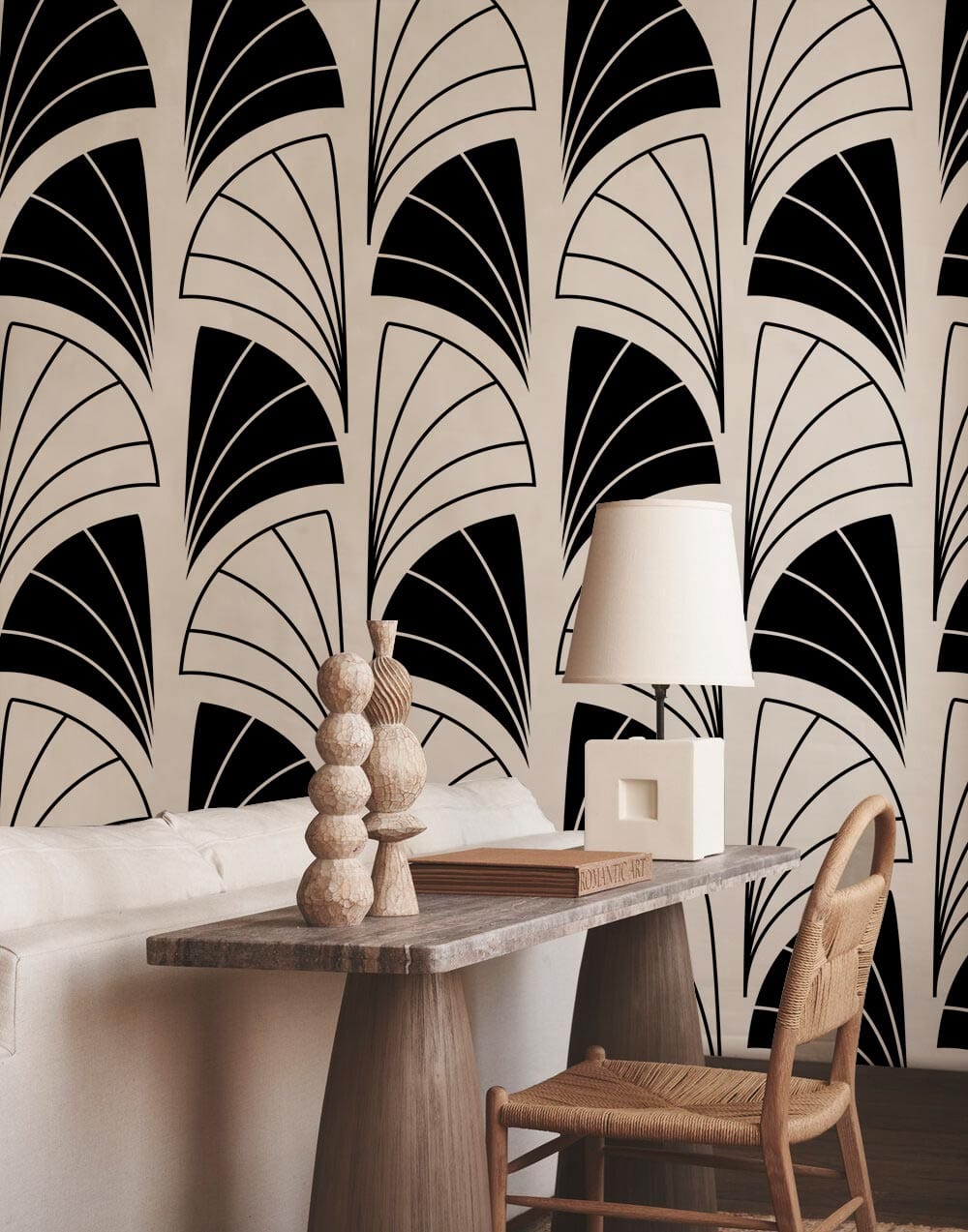 Our black and white art mural will set the tone for your deco flight. This wallpaper, which has an abstract and repeating geometric pattern over alternate monochromatic tones, can complement any area in your home while also adding a touch of the past. This might suit your minimalist taste if you're after a quiet and natural atmosphere but still want to keep your room tidy. Make the result even better by putting on bright white walls with tile flooring to have a soothing feeling to your space.