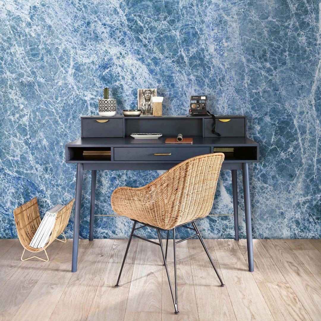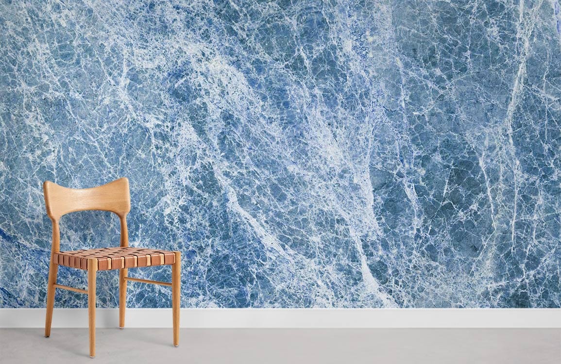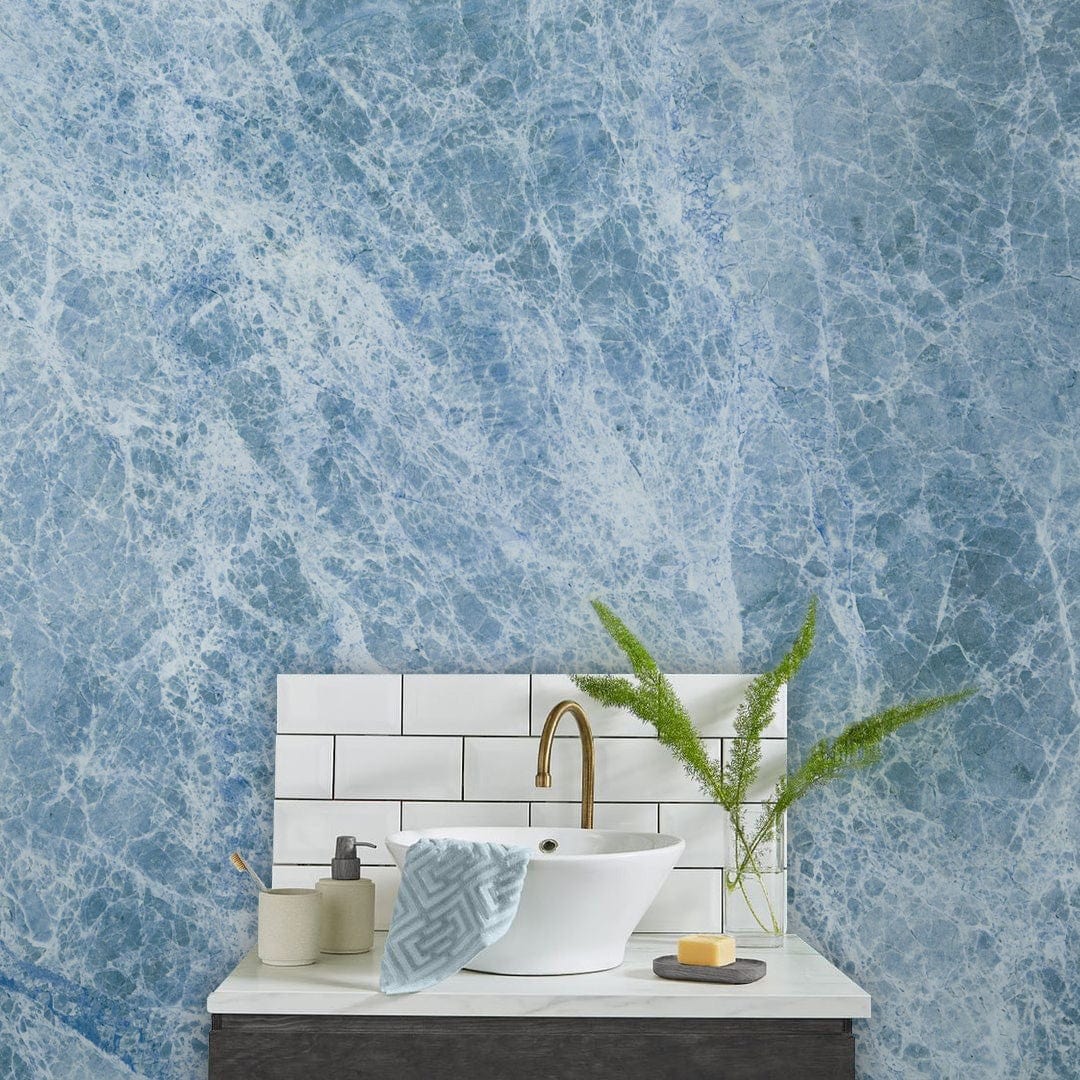 Blue colour stone is cut with small cracks to create a visually stunning slab of calacatta marble. Elegant and confident, this wall mural captures the variety and complexity of natural stone. Wall mural available in both removable peel-and-stick and permanent wallpapers. Printed with child-safe inks.