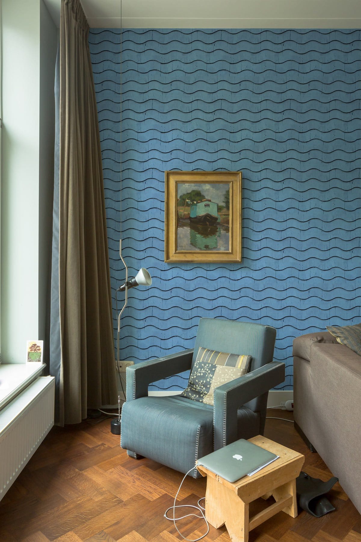 Have a moment to contemplate the beauty of this simple design of blue waves in this mural wallpaper. The design looks like waves in black with this light shade of blue at the background that will make your lace look wider than it is. a simple mural that is perfect for sevral decoration ideas, you can place it in your bedroom with caramel leathered furniture, and also at a living room with velvet couches and chiffon curtains, or at a bathroom for a very refreshing vibe. The colour’s palette of the design is so eye relaxing and will make you enjoy peaceful sleep and charming positive energy all over your place.
