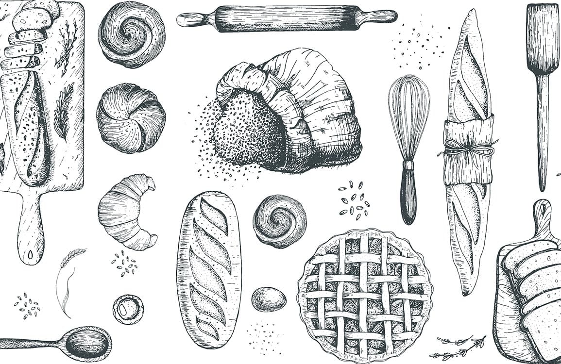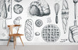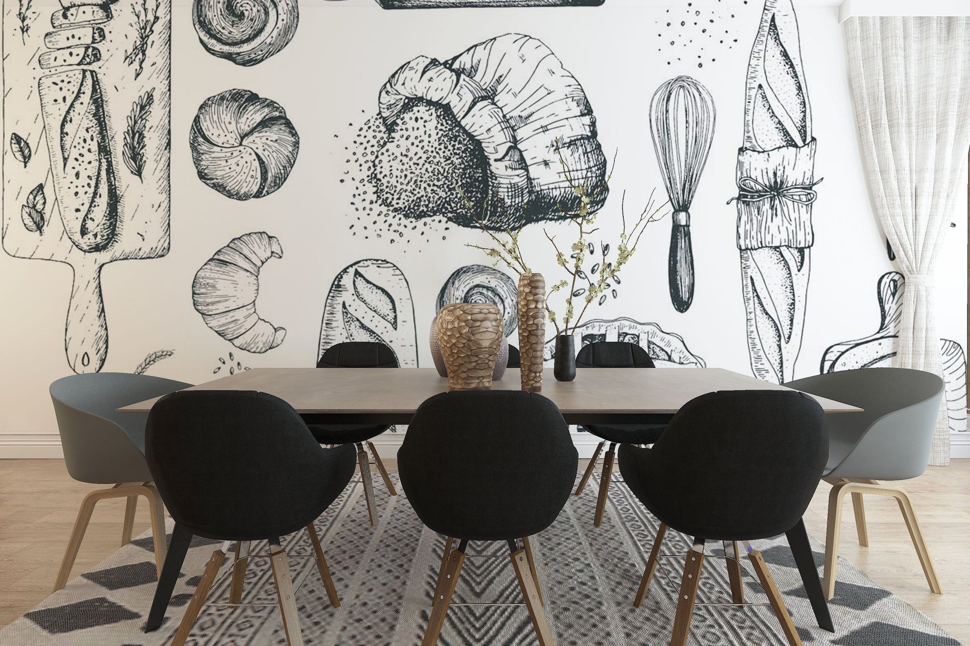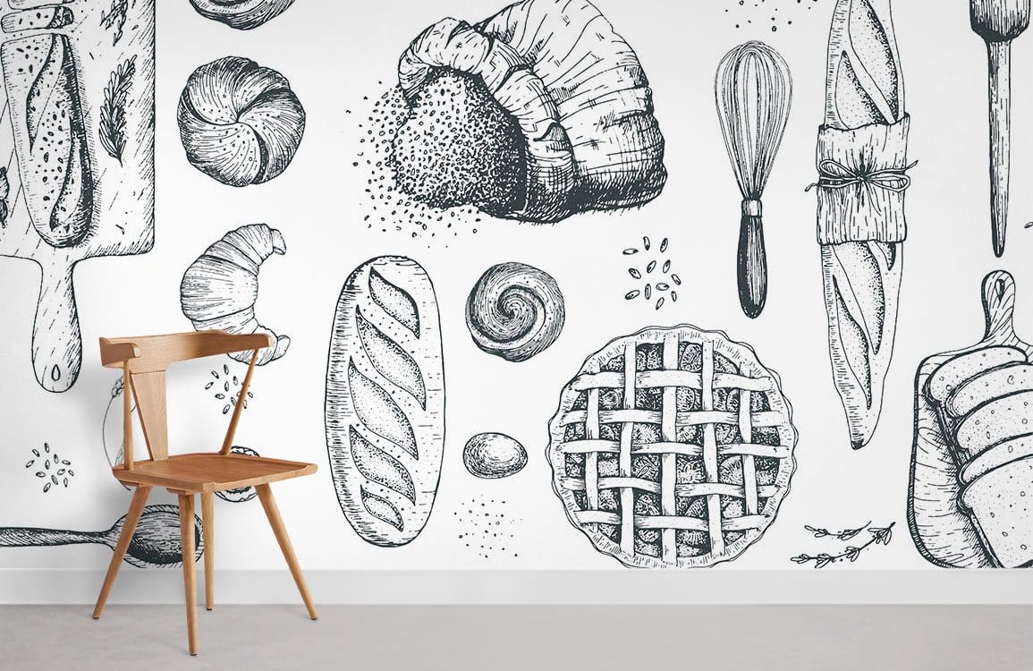 Time to get your dining room or kitchen a new look! This attractive hand drawn bread and toast Wall Murals under white background is a perfect wall mural to transform boring space into something unique and eye-catching. Why not try it out and pair with modern furniture home decorations.
