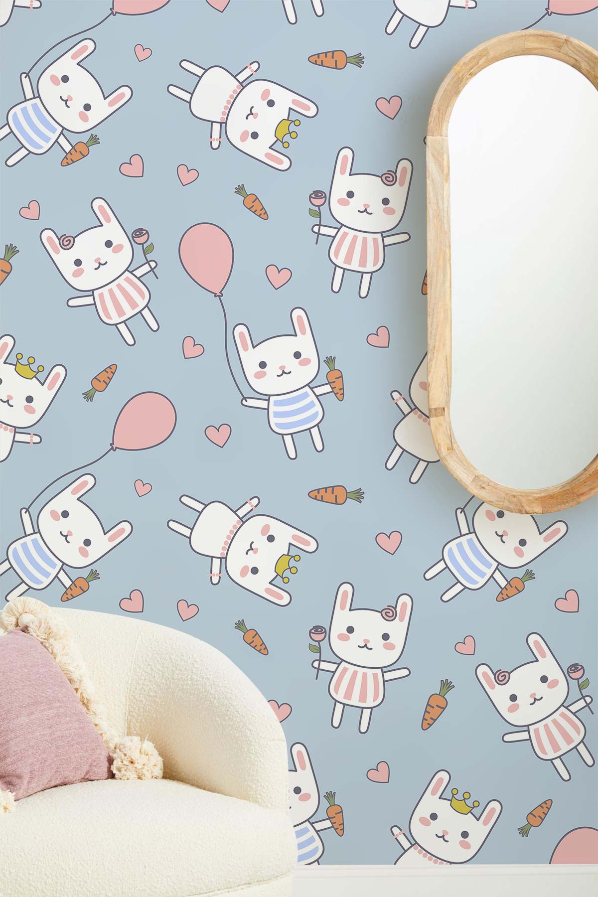 Take a moment to look at this overloaded cute girly mural wallpaper with bunny playing with balloons. This pattern is very light shaded with pastel colours and so perfect for your toddler baby who still at her early stage learning and pointing at what she sees. This is one of our illustrative murals that will enhance your kid’s imagination and help you build stories by giving out names to each character and asking them to explain what they see and teaching them the name of the characters and animals they see.