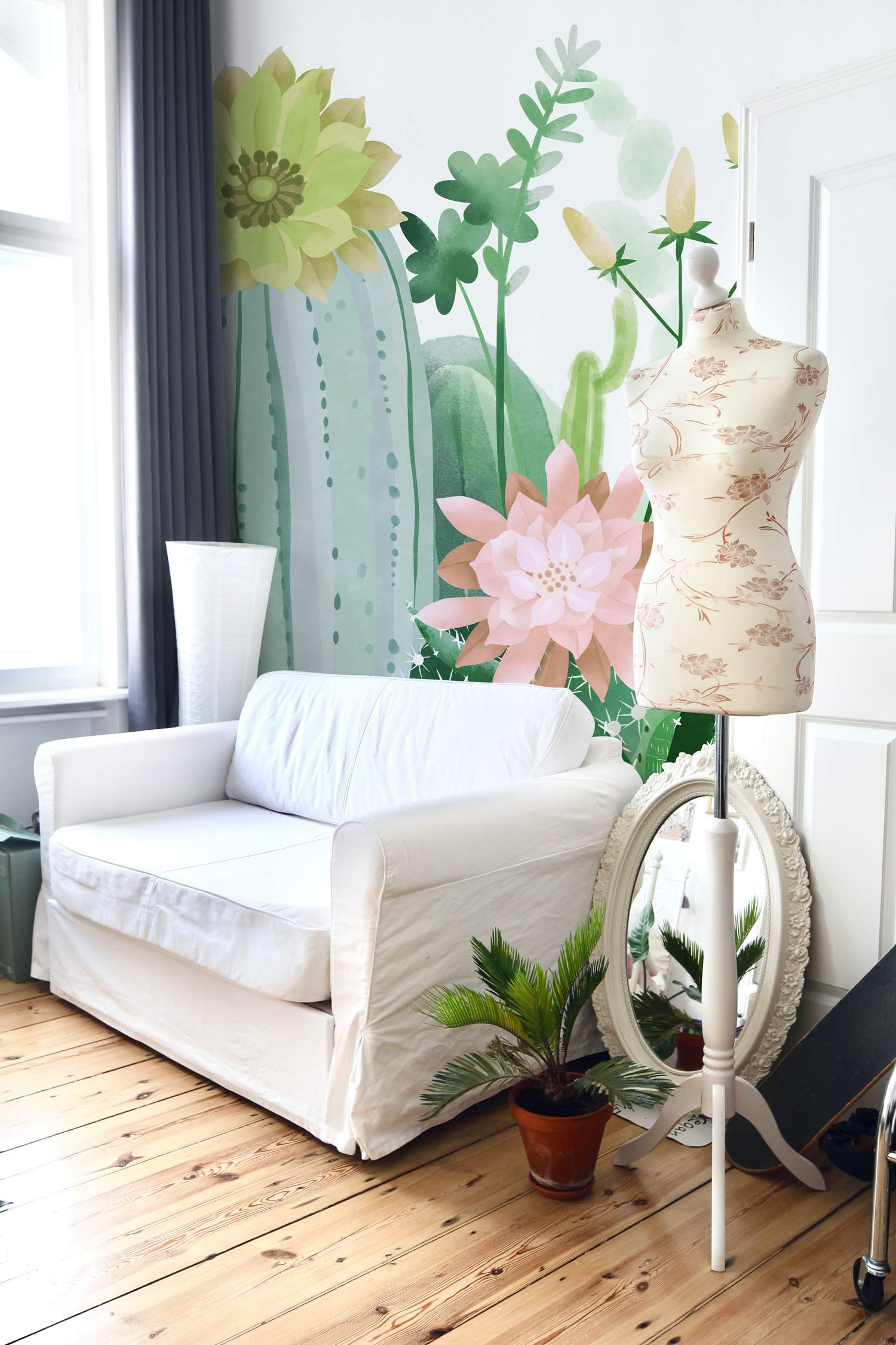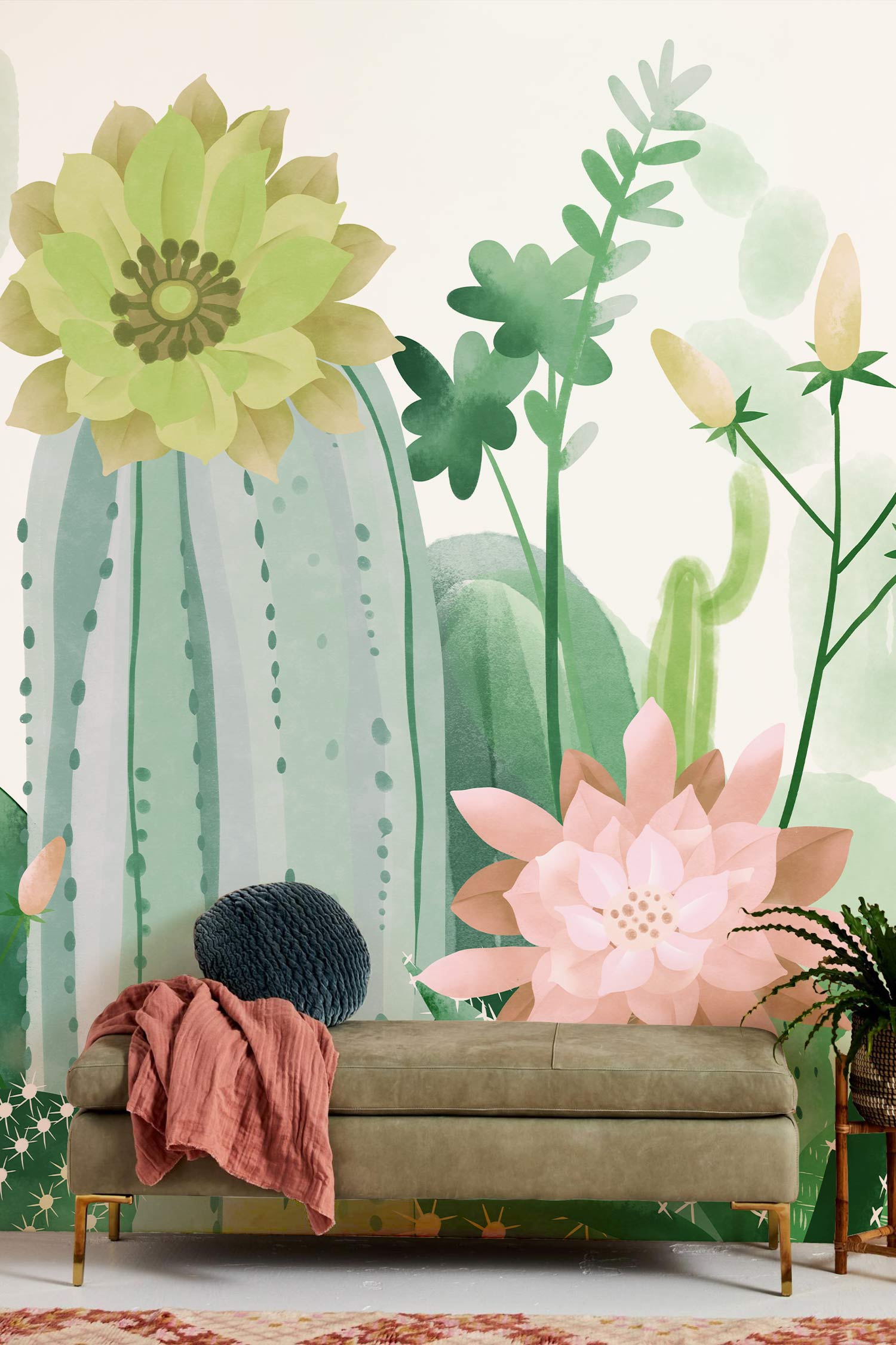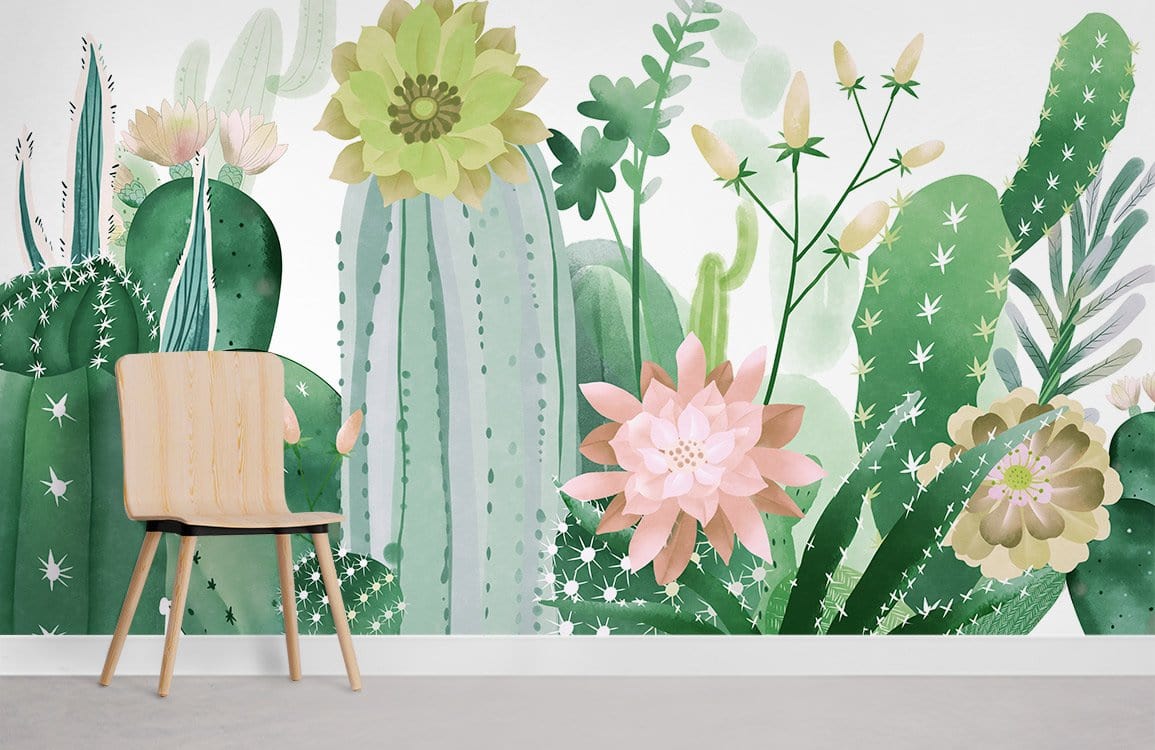 Adorn your wall with this cactus and flower Wall Murals. Let these green cactus and colourful flowers surround you and bring your rooms a fresh appeal. This gorgeous botanical wallpaper will guarantee to spice up your interior space with its simple aesthetics. Works well in a wide ranges of rooms such as living room, bedroom and dining hall.