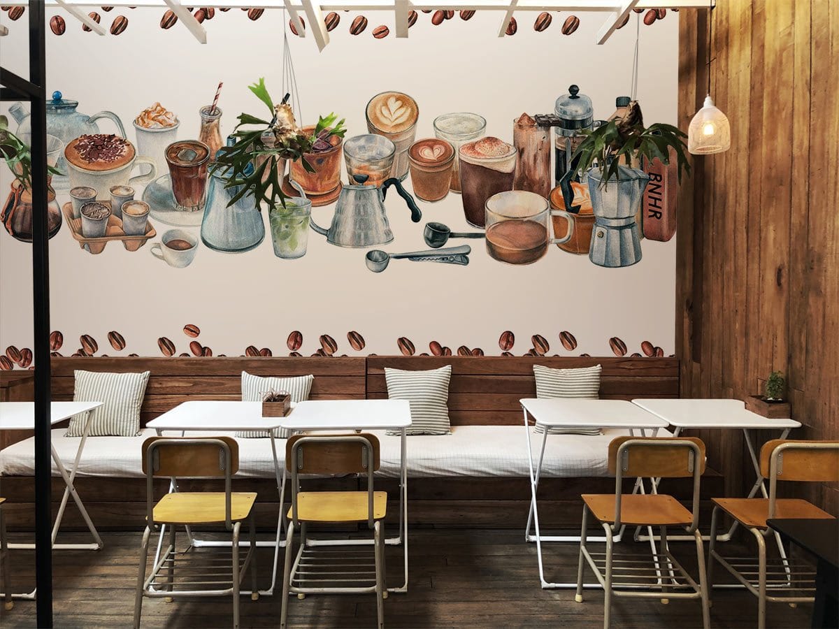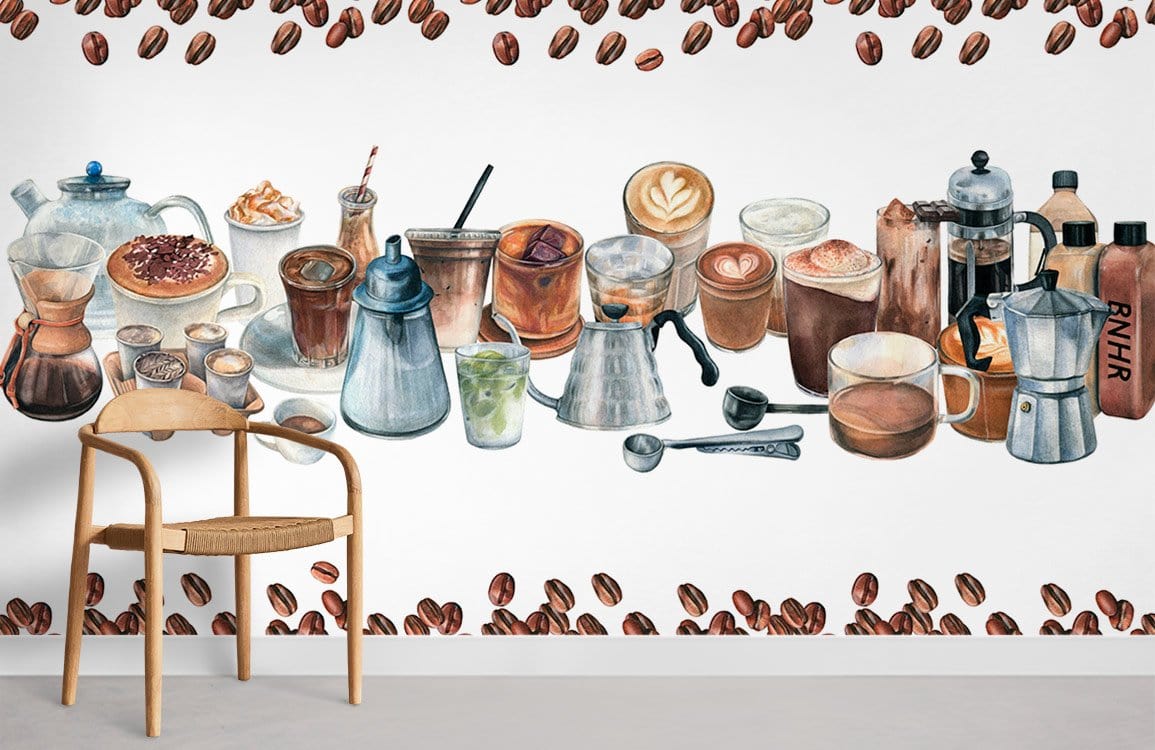 Are you a coffeeshop owner? or you are a coffee person who enjoys the coffee by all its shapes? We are here to tell you that we know how Coffee is a joy mood accelerator. Add a good taste to your kitchen, your café or to your coffee corner at home. Decorate your place by this Mural and worry free about customers, they will pay attention to how your place feels so relaxing and feel the smell of the fresh coffee beans out of your shop. The vibe of seeing all coffee processes and different types of it adds will do its magic. Our grey and brown shades Mural with different types of coffee and cubs will bring the Caffeine happiness out to your place. Don’t miss it, we offer different types of wallpapers that suits your place. Own it and customize it with dark brown wooden furniture and Impress everyone by this chic choice.