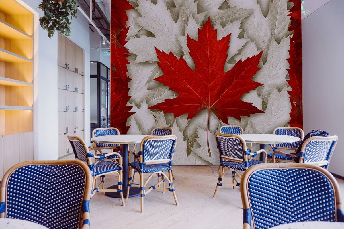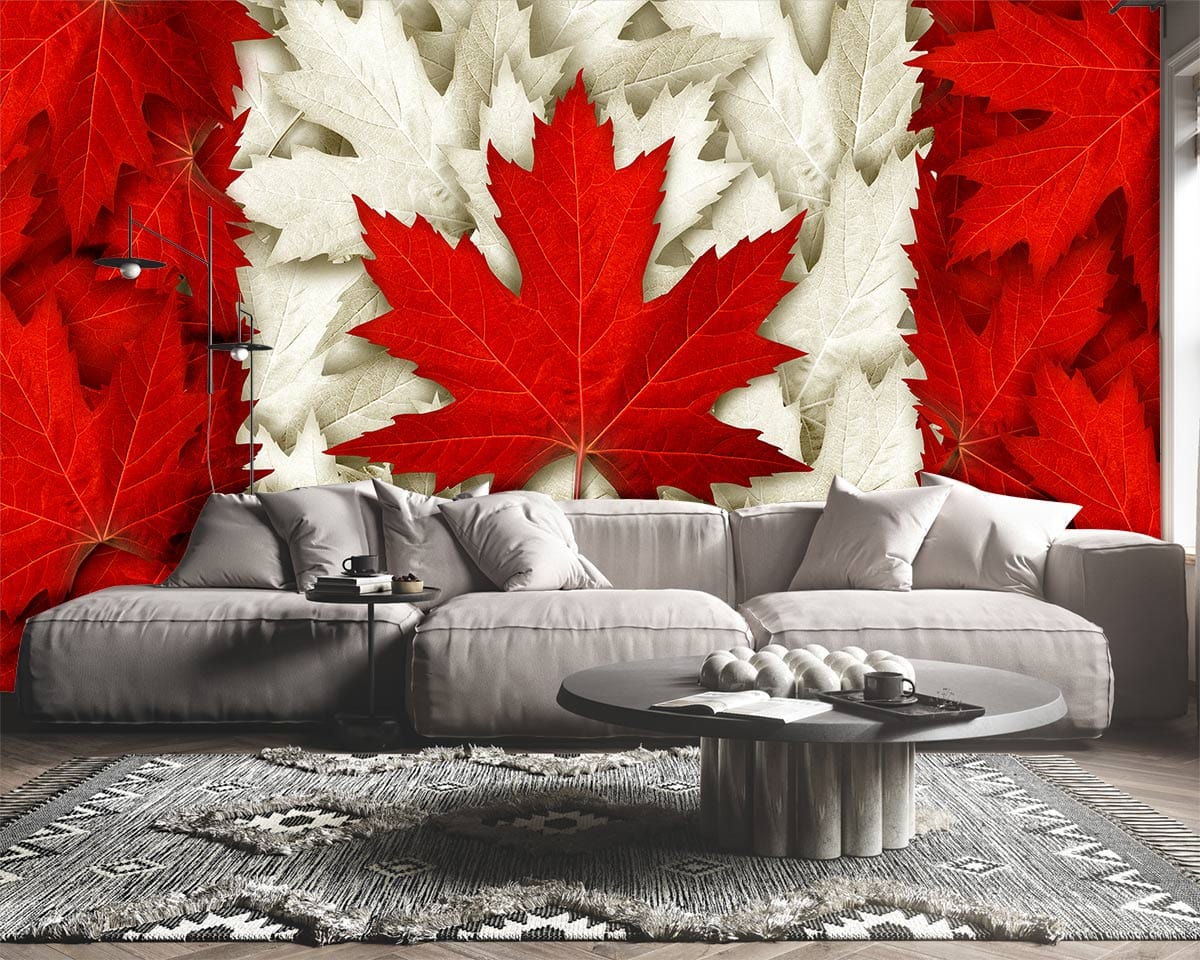 Proud of your Canadian heritage? Show it with our maple leaf flag design mural wallpaper. Honor the maple leaf, Canada's most iconic symbol, with this mural. It highlights Canadian heritage with a stylized tree inspired by one of the first modern Canadian flags and a red and white palette reminiscent of vintage Coca-Cola labels. This lovely decorating choice is sure to bring warmth to any room — it's perfect in a kitchen or dining room, or even as a striking backdrop in an office. Don't just make your home reflect who you are — make it shout it.