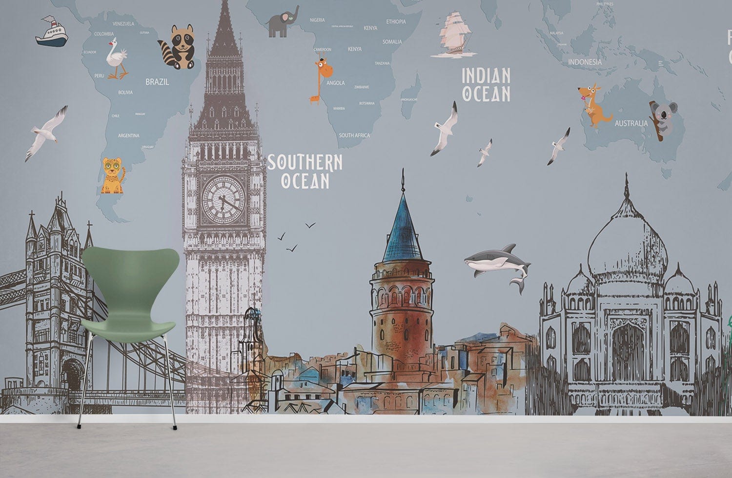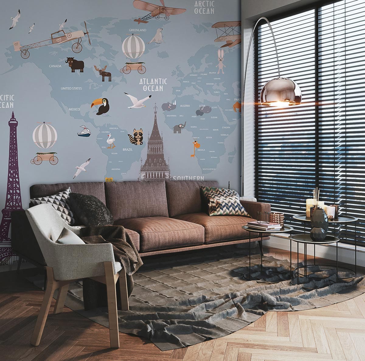 Plan your trip and adventure around the world for your kids with our world map Wall Murals. This cartoon world map wallpaper introduces you countries throughout the world in a cute and funny way. The map draws the most representative animals in each countries that will help your kids learn the world in an really interesting and effective way. Ideal wall mural for nursery room and kid's room.