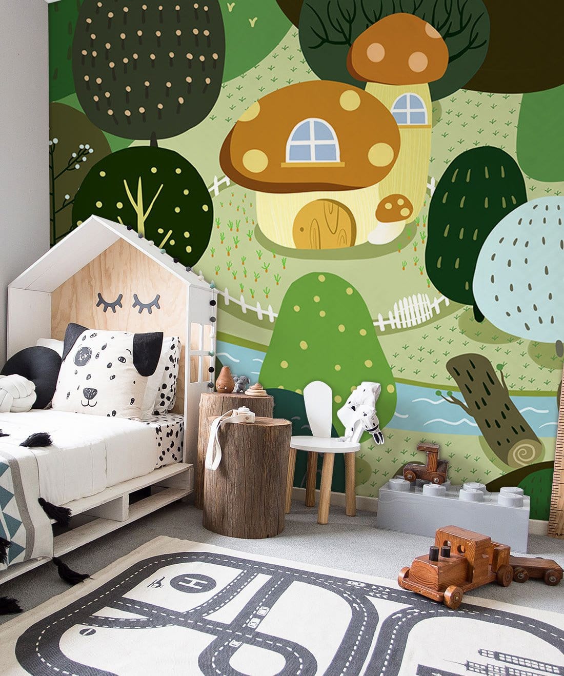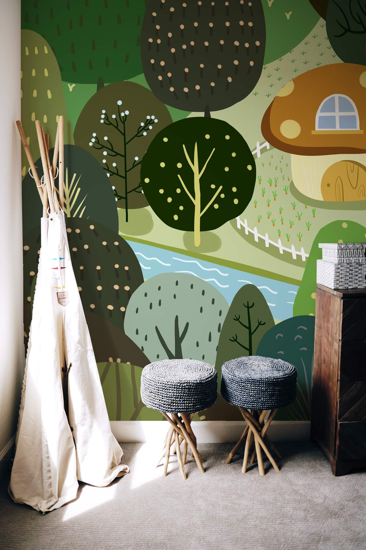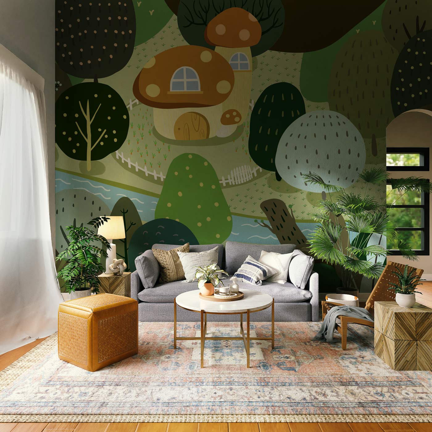 Decorate your room with our awesome collection of green trees and river wall murals in cartoon style. The vibrant feel lends a calming and soothing effect to your senses and allows you a close-to-nature feel. Breathe life and vitality in your living room or dining space with this versatile wallpaper as a wall covering and watch your space revamp itself instantly. Stay on trend by matching this fascinating natural magnificence with wooden or modern furniture style and live the look!