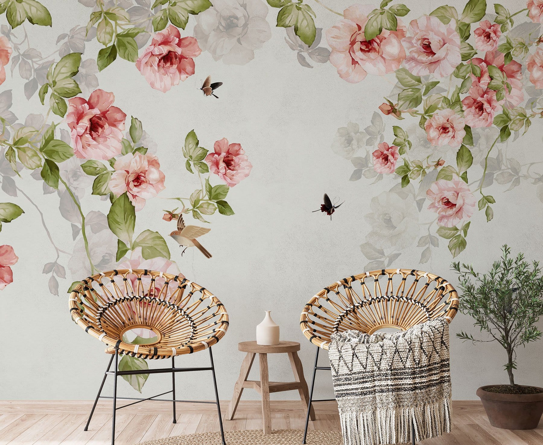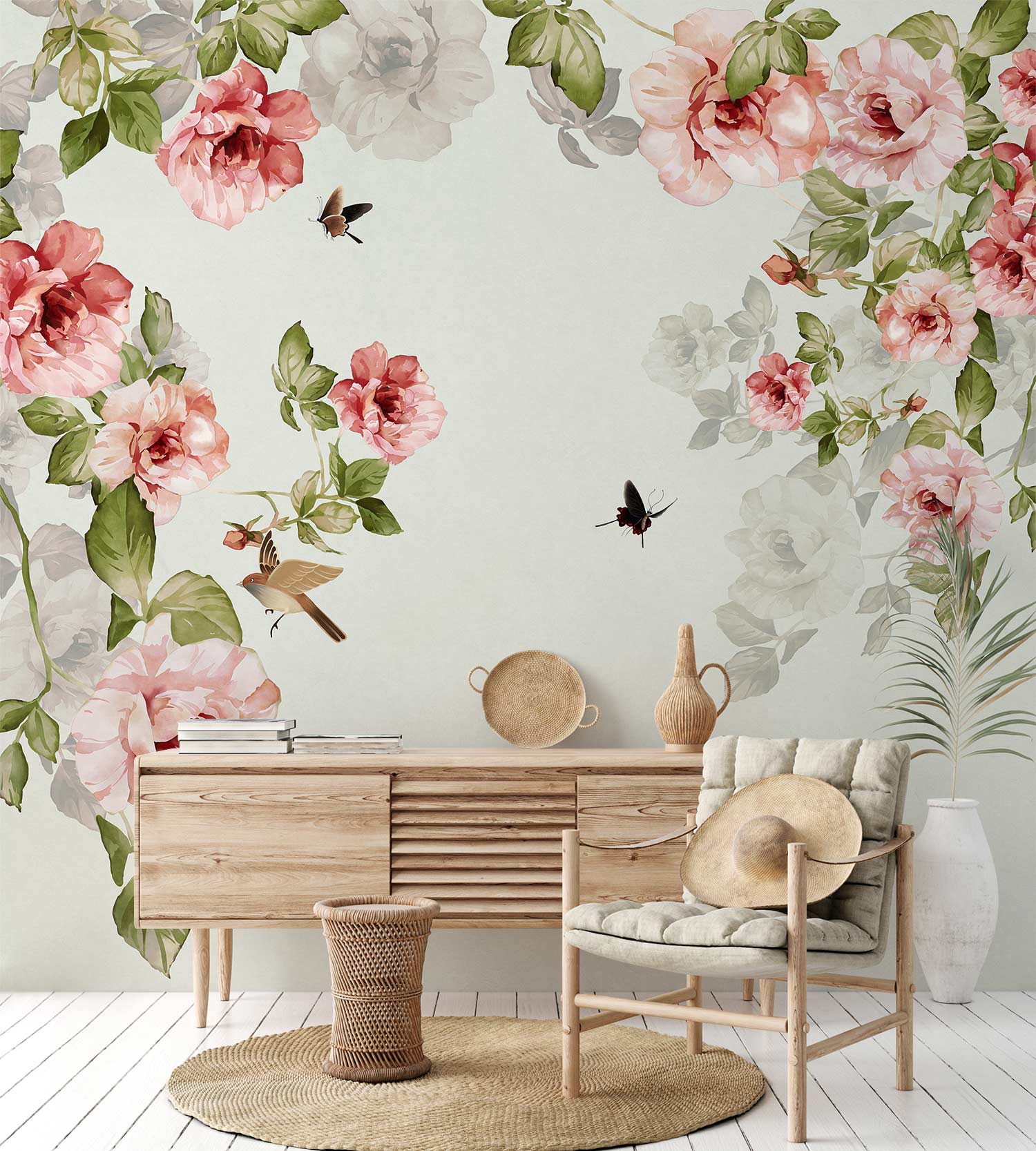Get this elegant vintage floral look with pink China roses on green rose bushes and white pastel background. Add a graceful feeling to your bedroom and living room. Available in both removable peel-and-stick and permanent wallpapers. Printed with child-safe inks.