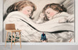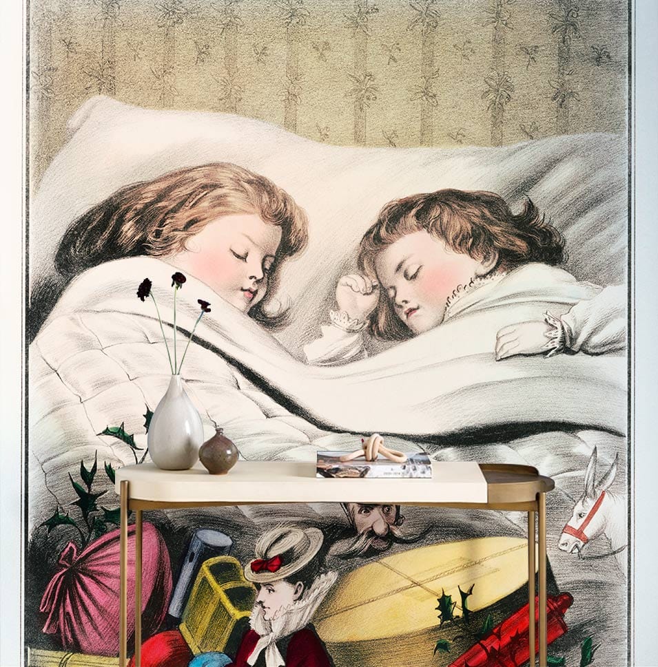 Contemplate the innocence in these little faces and enjoy the vintage artistic style with this attractive mural wallpaper for the two girls dreaming about their presents that Santa will bring up with him for them. A very unique wallpaper to style it with classic or semi modern furnishing. This mural wallpaper is a perfect classic choice for your baby born new room, or for unordinary design for your girls’ room before Christmas to make their little room look so special and full of happiness.