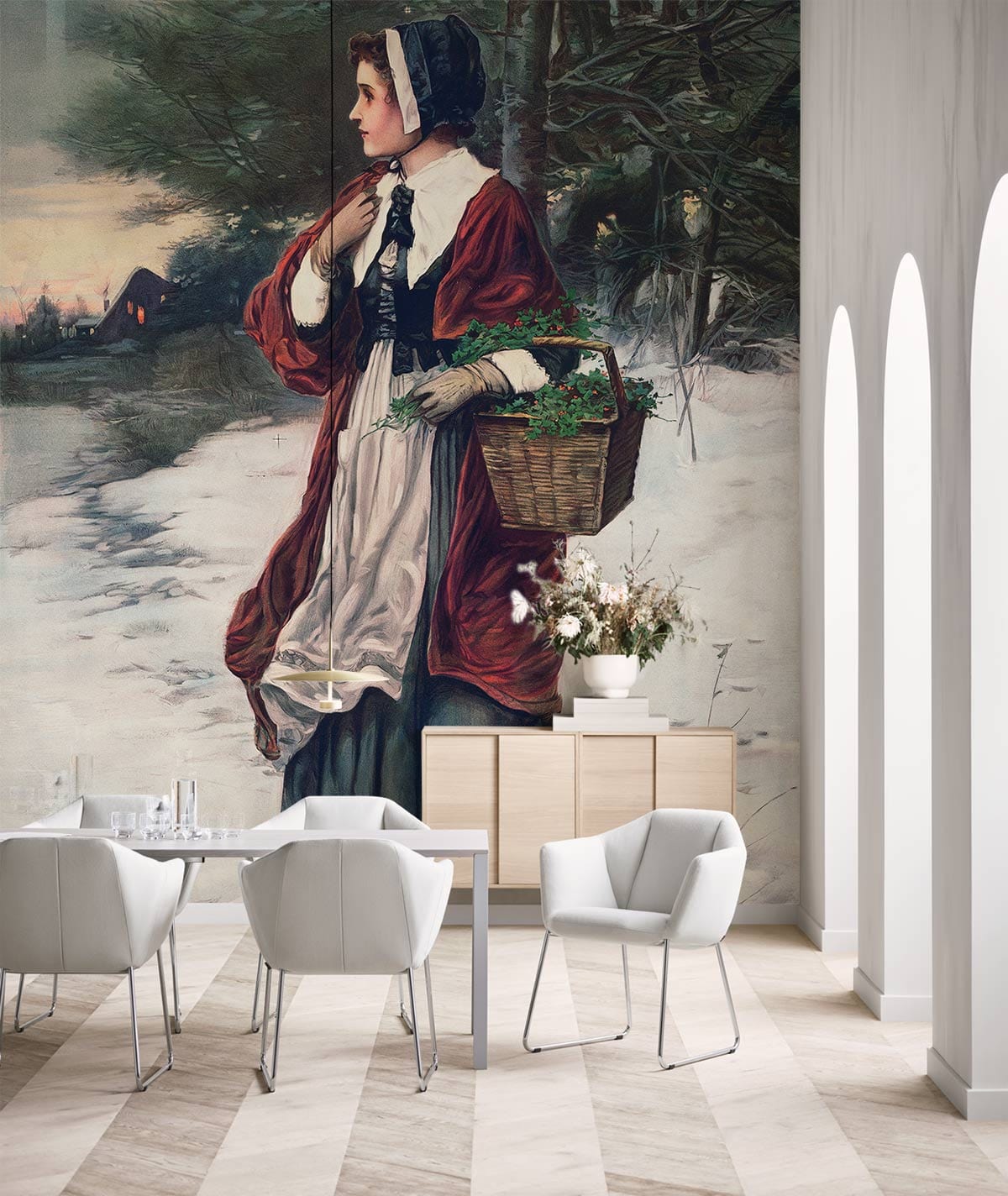 Have a moment to contemplate this beautiful Wall Murals of classic painting for a lady searching for her love at the Christmas morning. This classic art design is perfect if you are one of those who love the authenticity and luxury. The design is very classy and will give the effect of palaces’ decoration style. So, if you are looking for a chic style at your house. This wallpaper for the young lady should be at the top of your list. Style it at your reception with classic furniture and heavy beige curtains and golden couches. Or at the entrance of your company to grab the attention for all your guests and impress everyone with your taste in decoration.