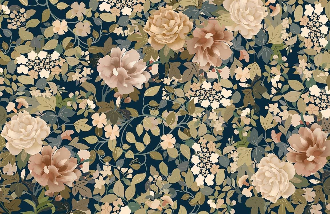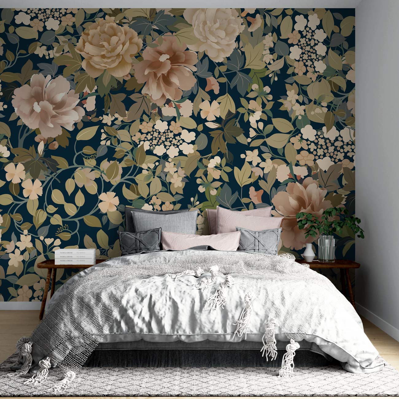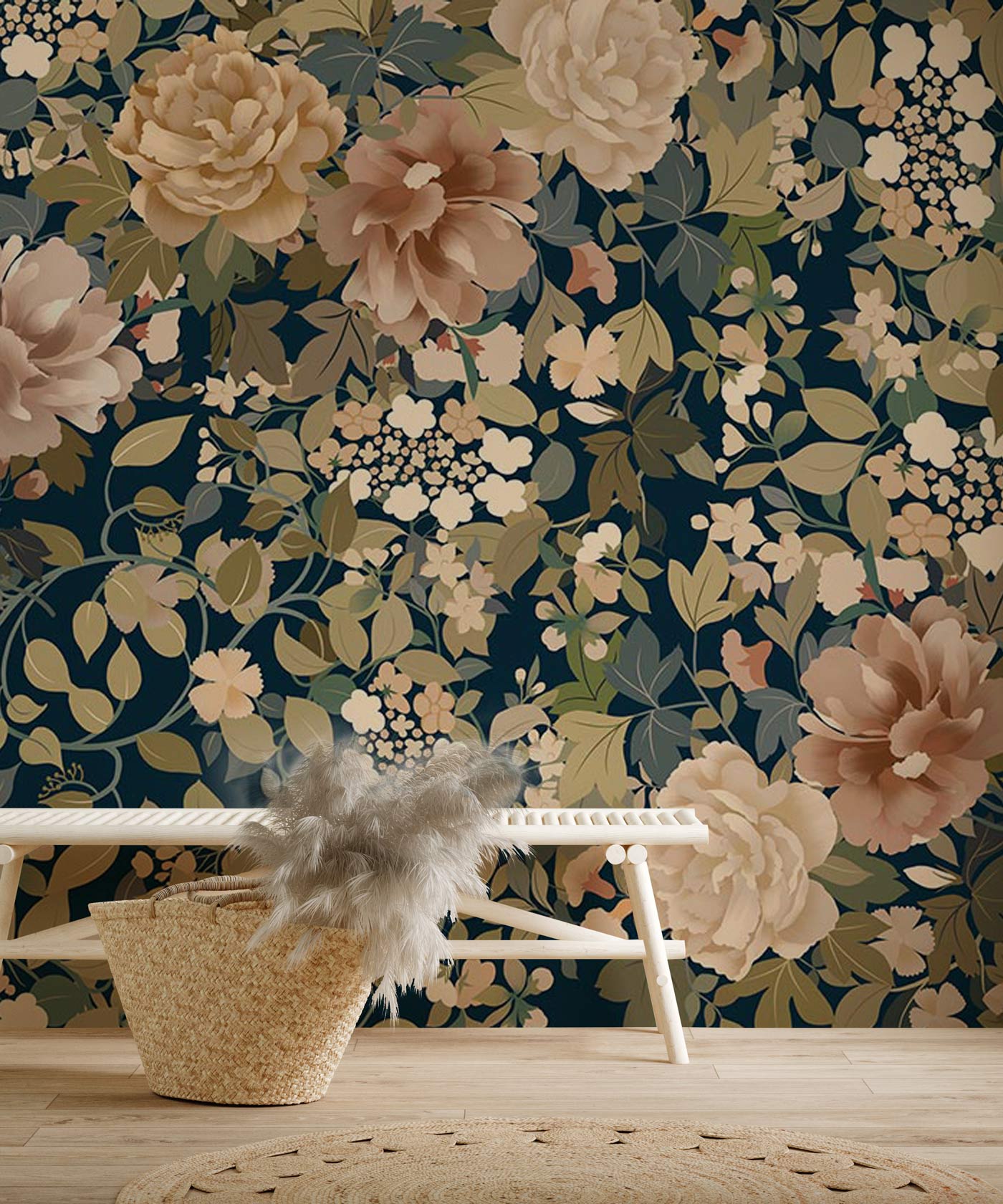 Bring your home to life with this classic and elegant floral Wall Murals. The pink flowers and pastel green leaves against the dark navy tone backdrop creates a vintage and classic look. Use it to accentuate a feature wall in your living room or dining space to instantly feel that the spring is coming. Pair the wallpaper with traditional or modern furniture of your choice and watch your space speak for itself!