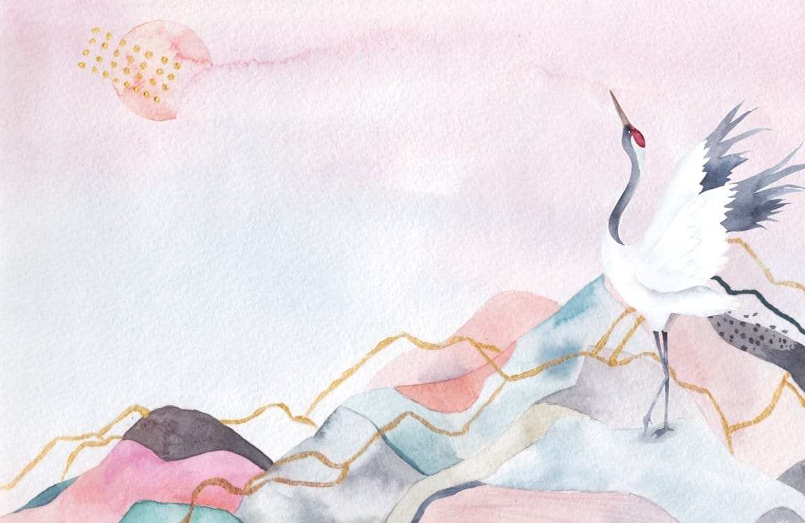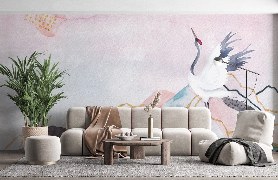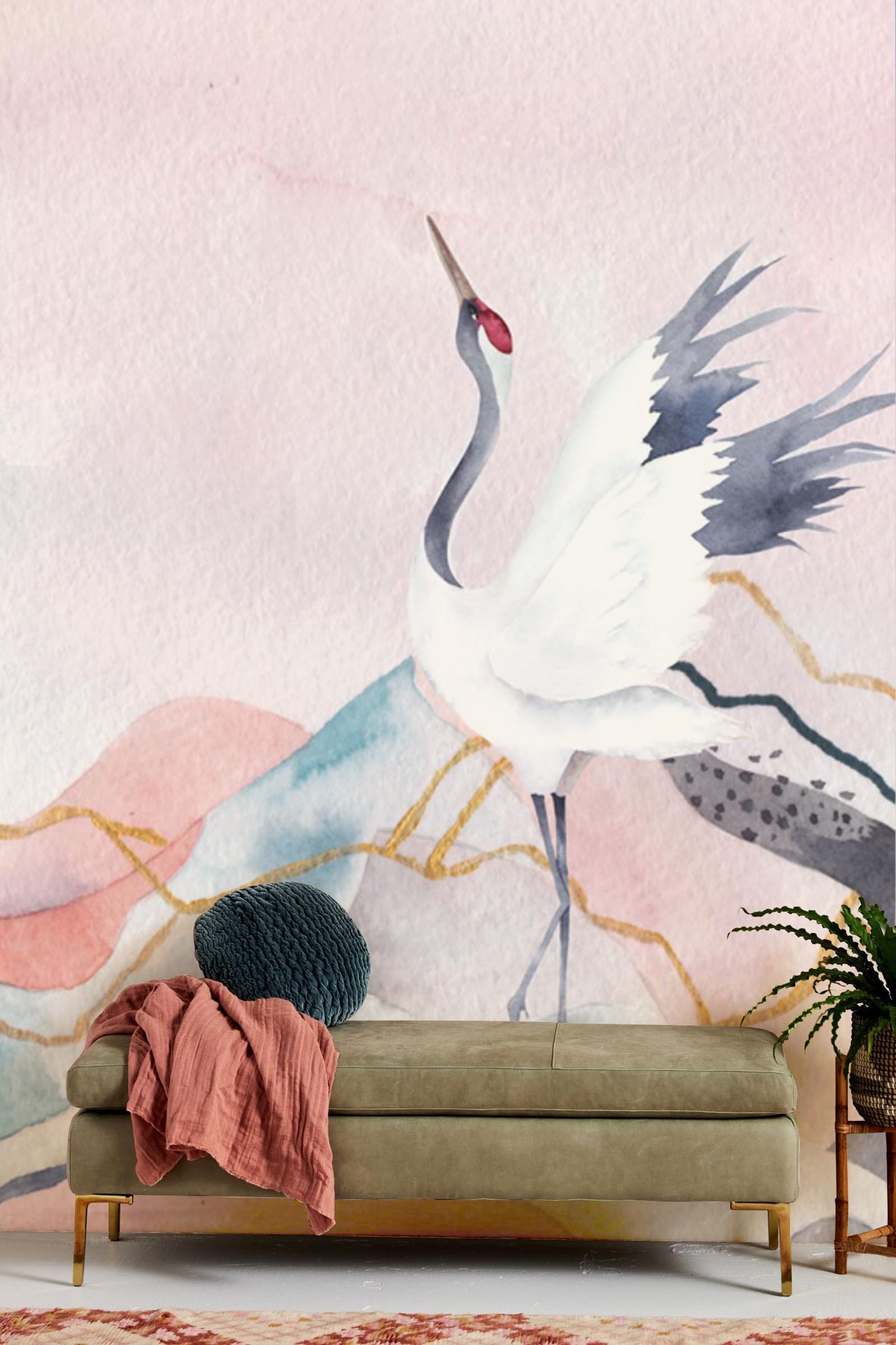 This pink dreamy crane Wall Murals is created with hand-drawn water colour technique.This beautiful, amazing painting of a stunning and elegant crane standing on the top of a mountain ready to fly, will be perfect wall mural for your home. Interesting rendering with a natural atmosphere and a refreshing wall decoration.