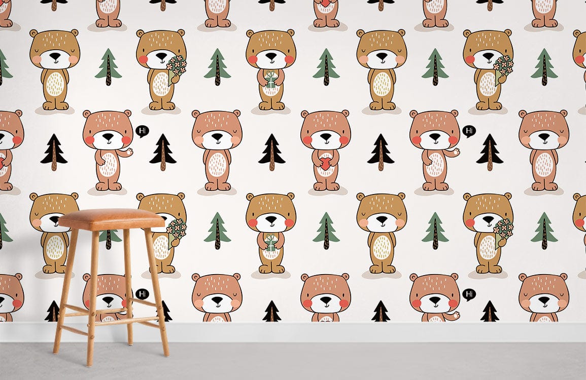 Our Bears in Love Mural Wallpaper is perfect for any child's room mural. The cute picture of in-love bears in alternating colours of soft pink and brown with adorable pine trees in between will cheer up your kids or babies and give them a sense of warmth. A sentimental and quirky design, the adorable bears in this animal wallpaper are just too cute! Show the love your kids have for teddy bears and create a fun space in their rooms.