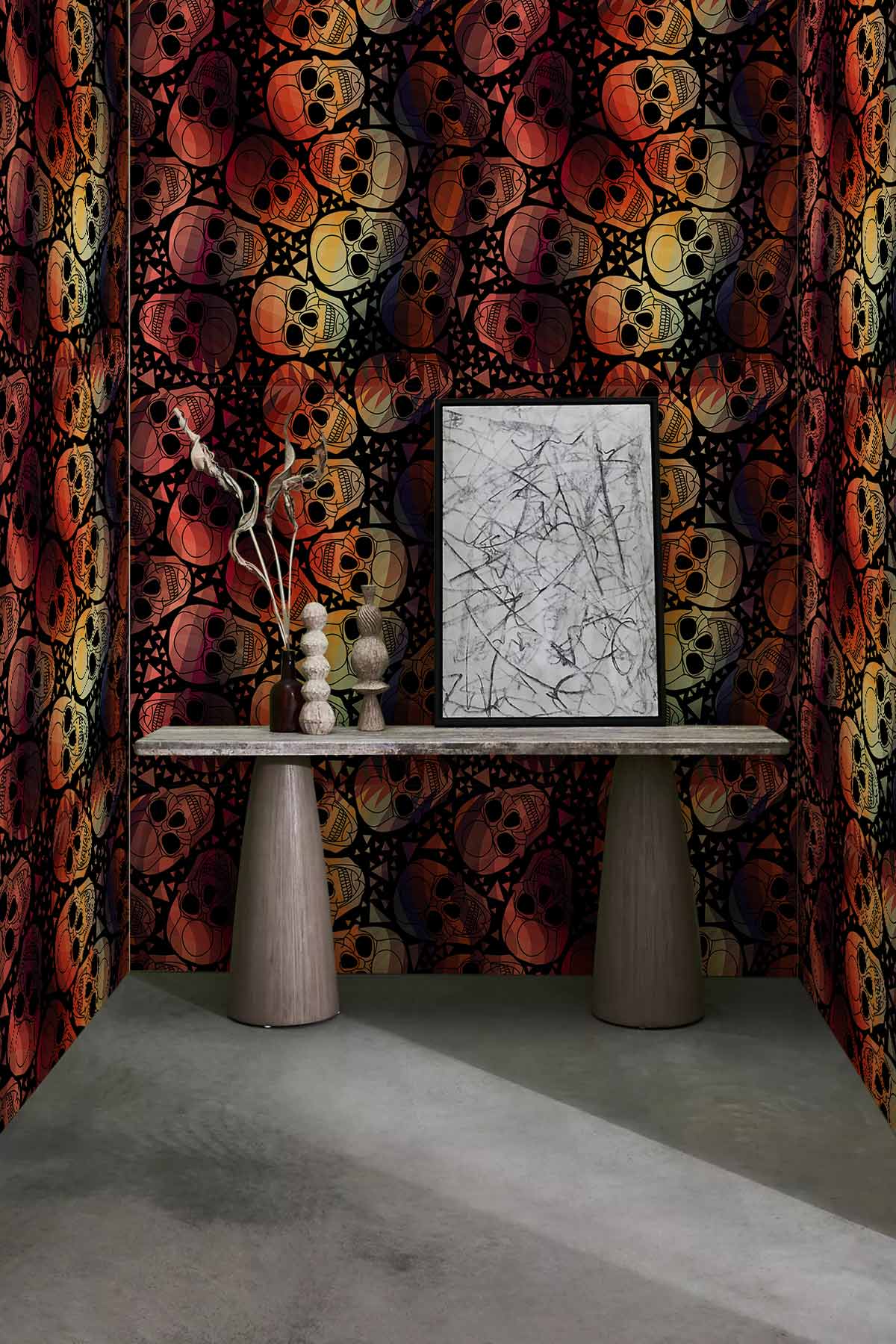If you enjoy skulls and skeletons, this pattern is perfect for you. Our skeleton painting pattern mural wallpaper has dark red ombre- coloured skull bones with dramatic shutter effects set against a simple dark background. Bold, strong lines are used to form the skeletons in this artwork. With skeletal arts, this unique design will make you drool and is guaranteed to spark conversation in your place. It's ideal for people who spend a lot of time in their living room and bedroom.