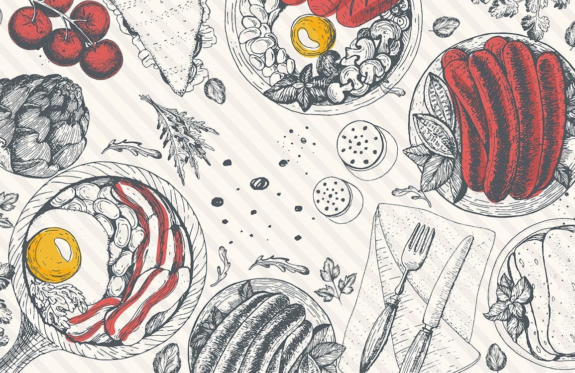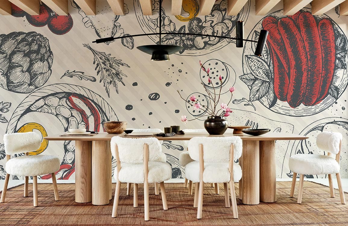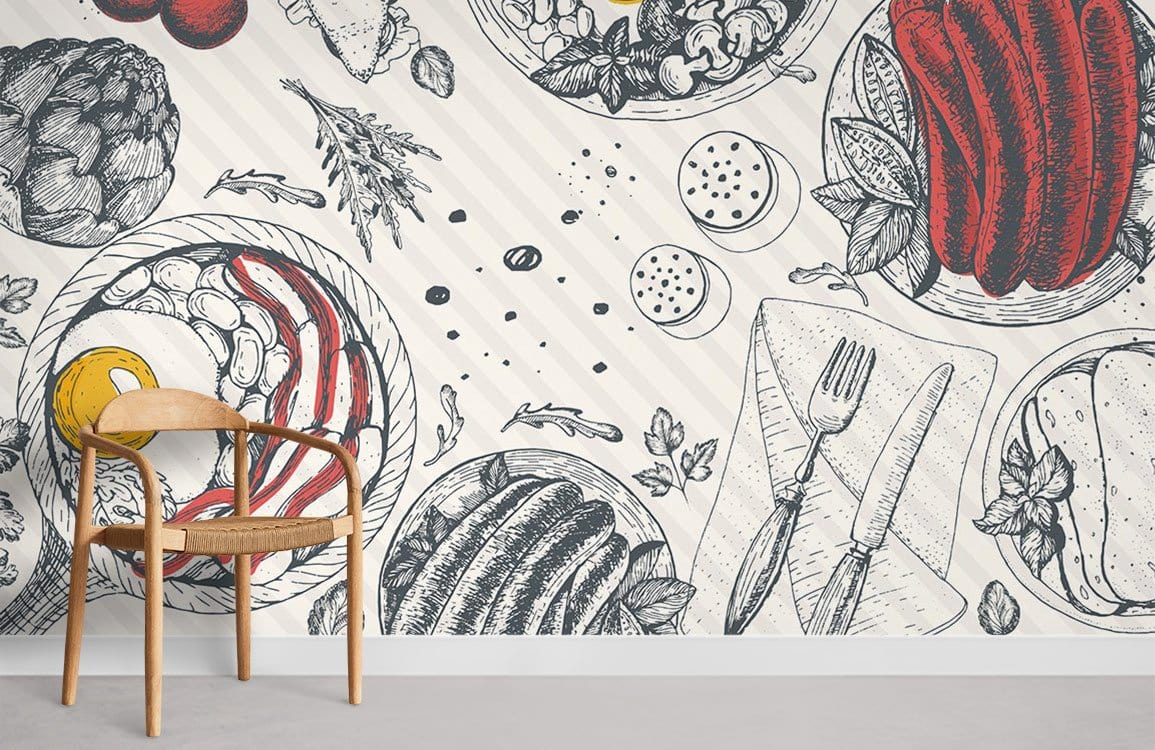 Time to get your dining room or kitchen a new look! This attractive hand drawn dinner food Wall Murals under?pastel stripe?background is a perfect wall mural to transform boring space into something unique and eye-catching. Why not try it out and pair with modern furniture home decorations.
