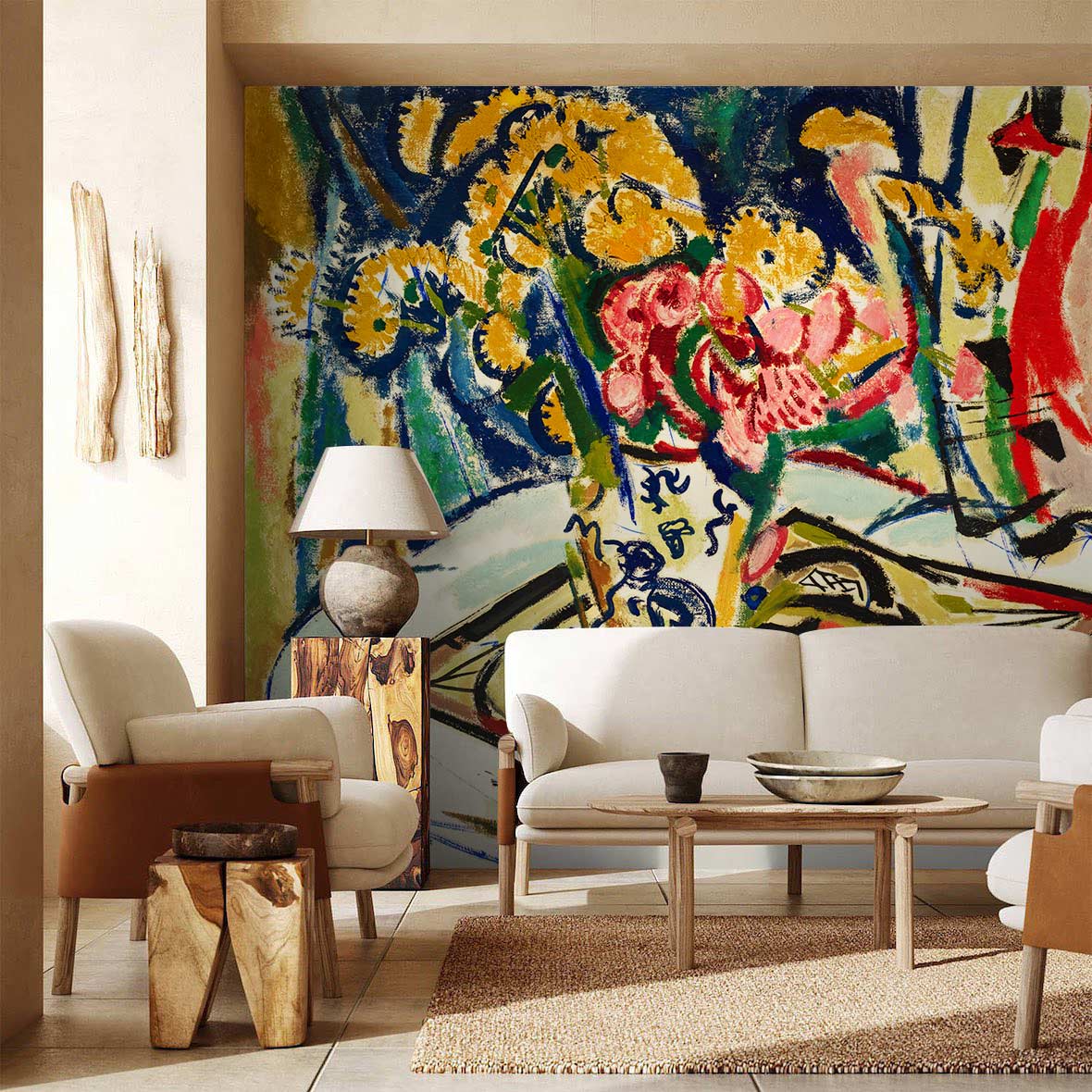 A Bohemian art style for a vase and flowers that will turn you place spirit completely. This colourful wallpaper design is your gate to a very modern and chic trendy house. The colourful vibe that this Wall Murals will boost the energy to your walls and make them speak out ART. Enjoy the modern design that will make your place look happy and bright. This Wall Murals will make your living room a piece of art with modern velvet couches. Also, if you are looking for a very catchy bedroom wall mural with really positive vibes this one will be perfect with white wooden bed and decorations.