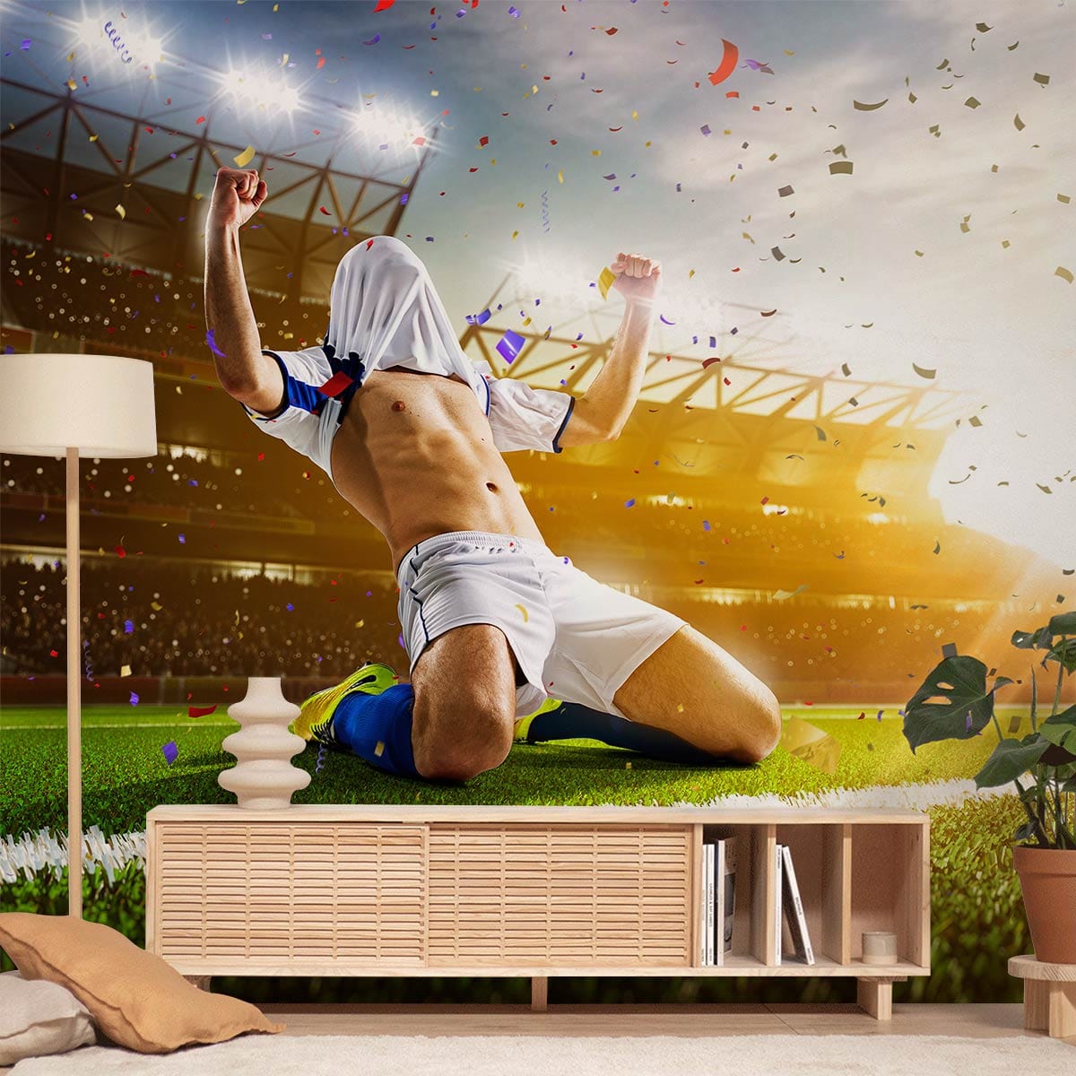 Celebrate a soccer victory in our Soccer Play Victory Wall Murals that flaunts a striking soccer player on his knees to show his team's success. This mural is a great way to add a pop of colour and character to your room. Whether it's in your man cave, kid's room, or even in the locker room of your favorite sports team, this wallpaper is one way to show off your love for soccer and bring an extra level of excitement to any room.