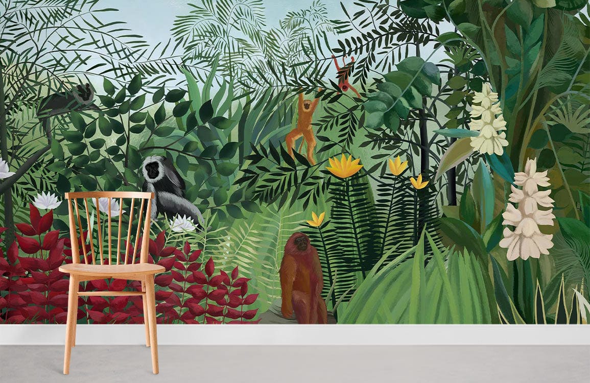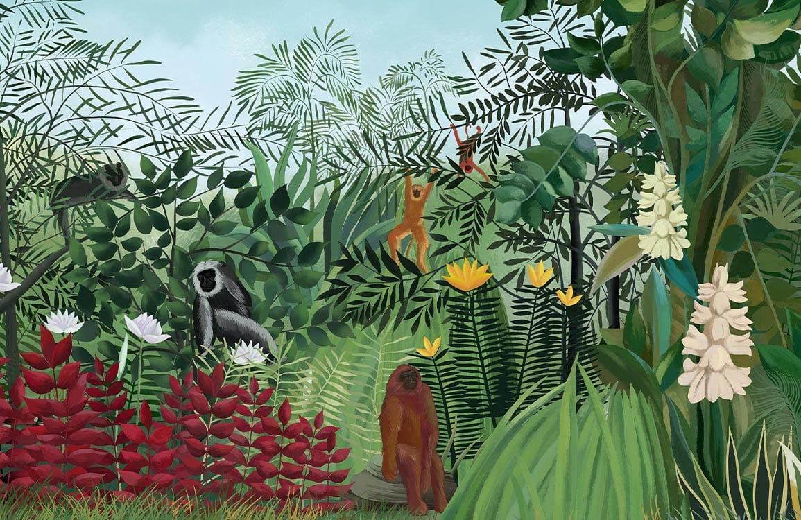 Share the wonder of an orangutan with your home decor. This Forest Orangutan Wall Murals features playful orangutans in their natural habitat of the forest. The bright orange of the monkeys is paired with green leaves and brown tree trunks, creating an organic look that fits any home interiors. This safari-themed mural wallpaper is a great addition to your child's room or nursery while providing a fun way for the whole family to get involved in decorating their house. Each piece comes in its own pre-pasted, bubble-free liner, so installation is simple and mistake-free.
