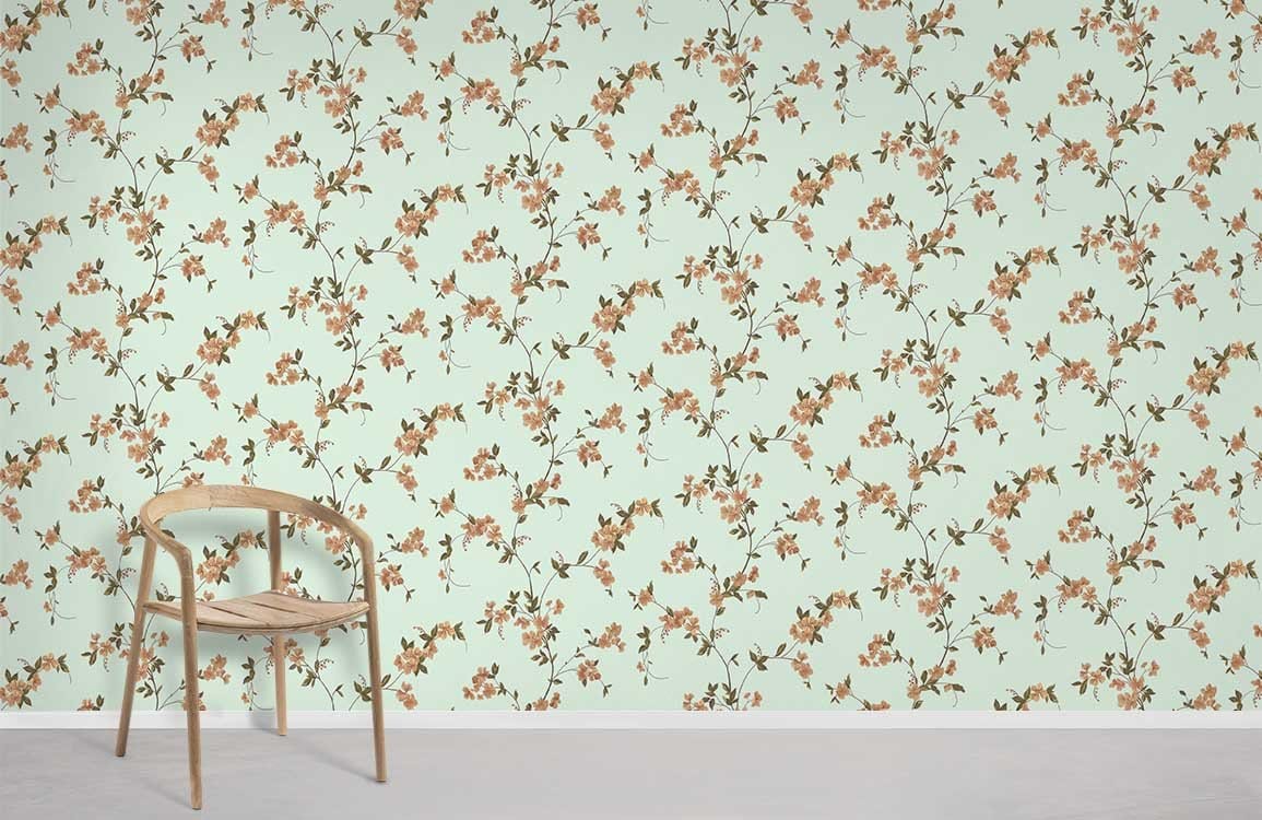 Beautify your home with this repeat flower vine pattern Wall Murals. This design in mint green background with flower vines crawling across your walls will instantly add more freshness to your rooms. Pair it with traditional furniture and home decors for a charming look to your Interiors.