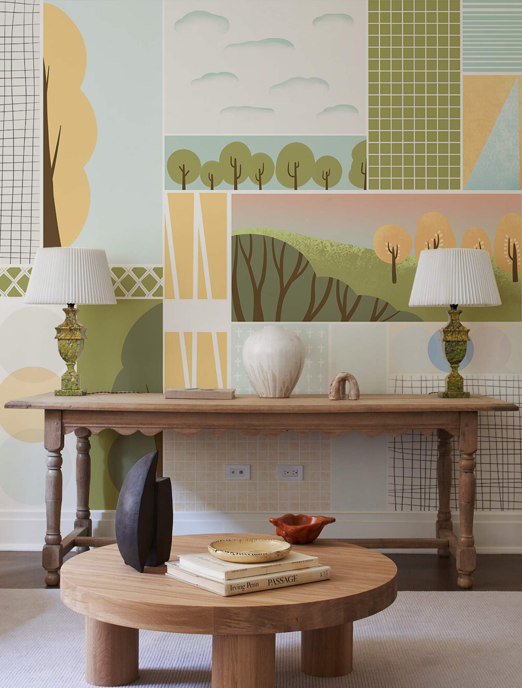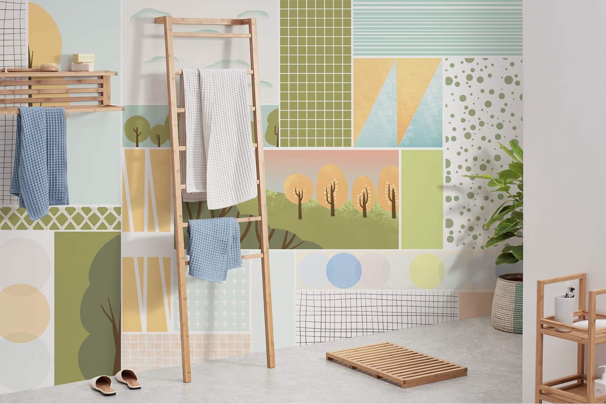 Bring your wall to life with this beautiful Wall Murals. Relieve your stress and enjoy the freshness from the images and design in soft pastel colours. The different styles of geometric colour blocks are powerfully united with the trees, dots and lines yet not too overwhelming. Add a peaceful and calm atmosphere to your living room, bathroom, bedroom and dining hall with this art deco. Work perfectly to your modern style furniture and home decors.