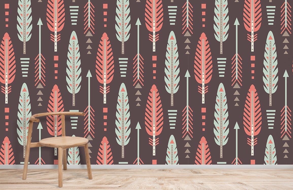 Adorn your wall with this stylish geometric and arrows Wall Murals.This decorative American Indian style leaf, arrows and geometric elements pattern under dark background will surely add a cool and ethnic style in your space. You can pair it with modern style furniture to make it even more stunning.