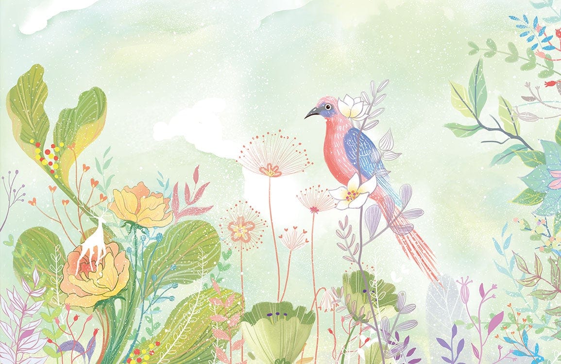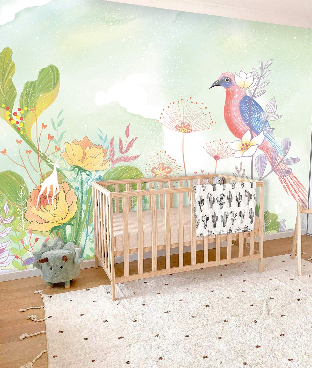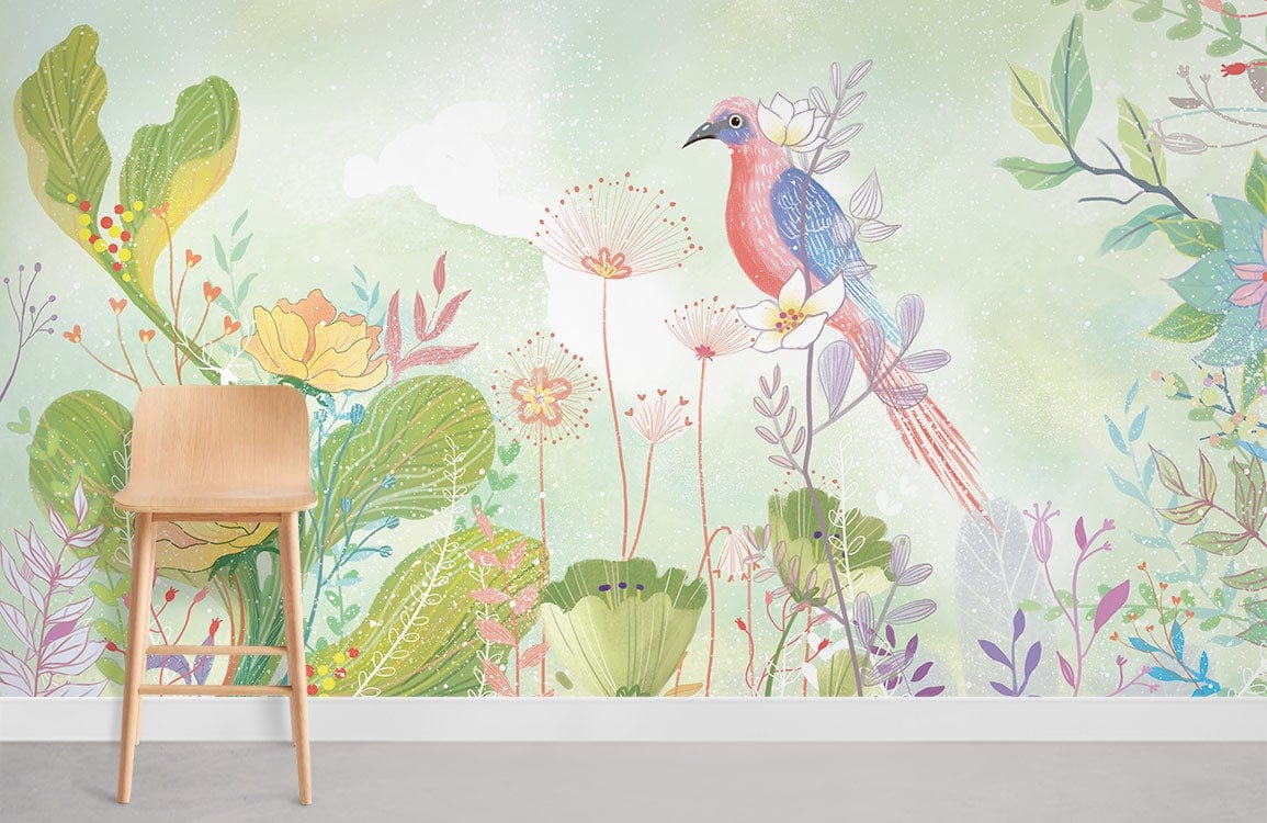 Dive into the simplicity and calmness with this design of a parrot between the flowers in a fantasy world. Feel the relaxation between the leaves and get yourself moments of peace with this mural wallpaper will make your place feel so relaxing and calm. The palette of the design is so light and the pastel colors give a calm effect on the place and make is feel wider. This design is good for kids’ rooms and newborns because it will make them feel calm and have a long deep sleep. This calming design is also perfect for your bedroom and will make you feel so relaxed and same if you use it in a living room and will make your guests feel comfortable.