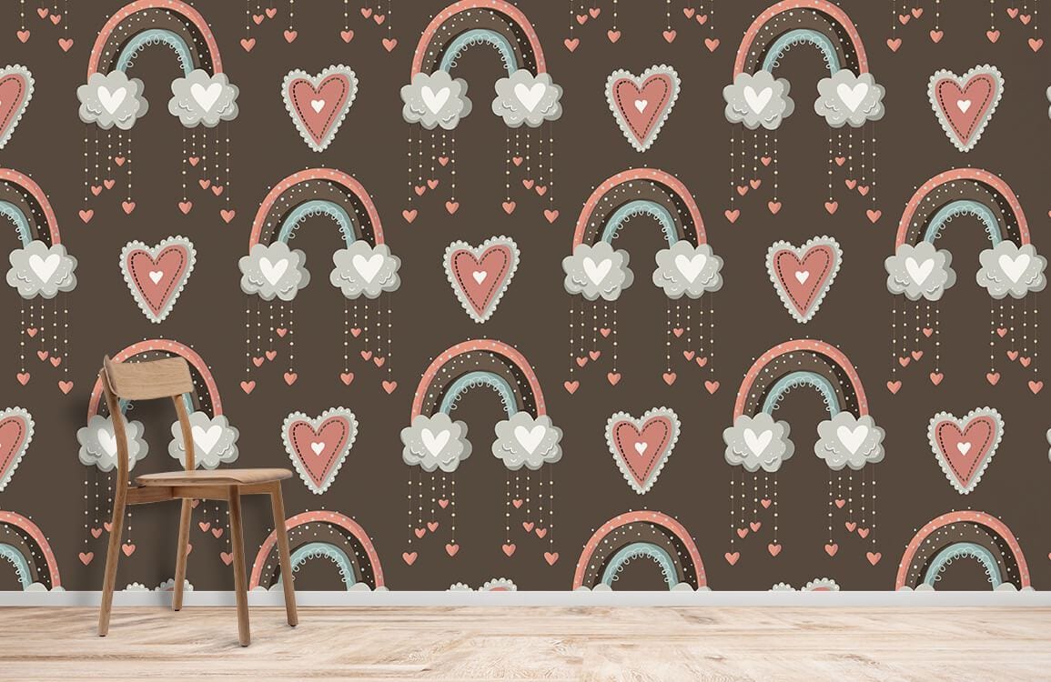 Create an appealing space with this heart and rainbow Wall Murals. This heart and rainbow pattern graphics with chocolate brown background creates a cute and tasteful feeling to the interiors. Bring cheer to your kid's room with an instant revamp with this adorable design. Perfect for your child's room or the baby nursery room.