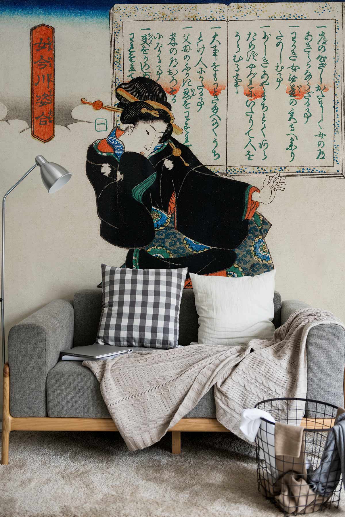 Contemplate the beauty of this very unique mural wallpaper for Japanese numerals that show the culture in Japan and the numeral teaching with the Japanese female reading them from the wall behind. If you are setting a Japanese restaurant this wallpaper will add a very special taste to the place, also if you are looking for a cool wallpaper for your classes you can choose this for the Japanese teaching class to put the students into the mood.