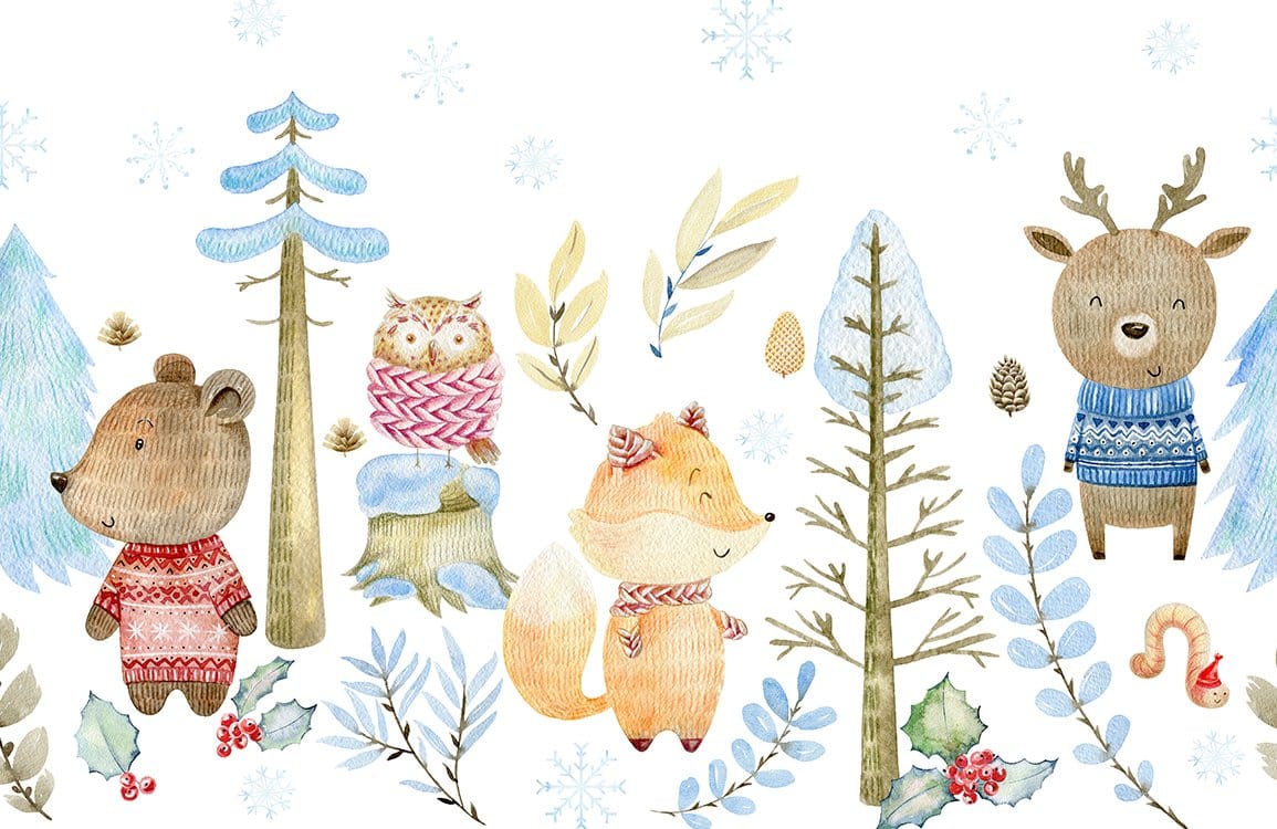 In the winter of the forest, joyful animals like bears, deer, owls and squirrels gather together. This adorable Wall Murals is a perfect decor on your wall. This beautiful, amazing painting with a White colour background will be perfect for the indoors in your home. Interesting rendering with a natural atmosphere and a refreshing wall decoration. Amazing wall covering for child's room, nursery room and playroom.
