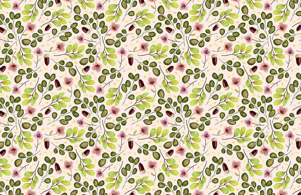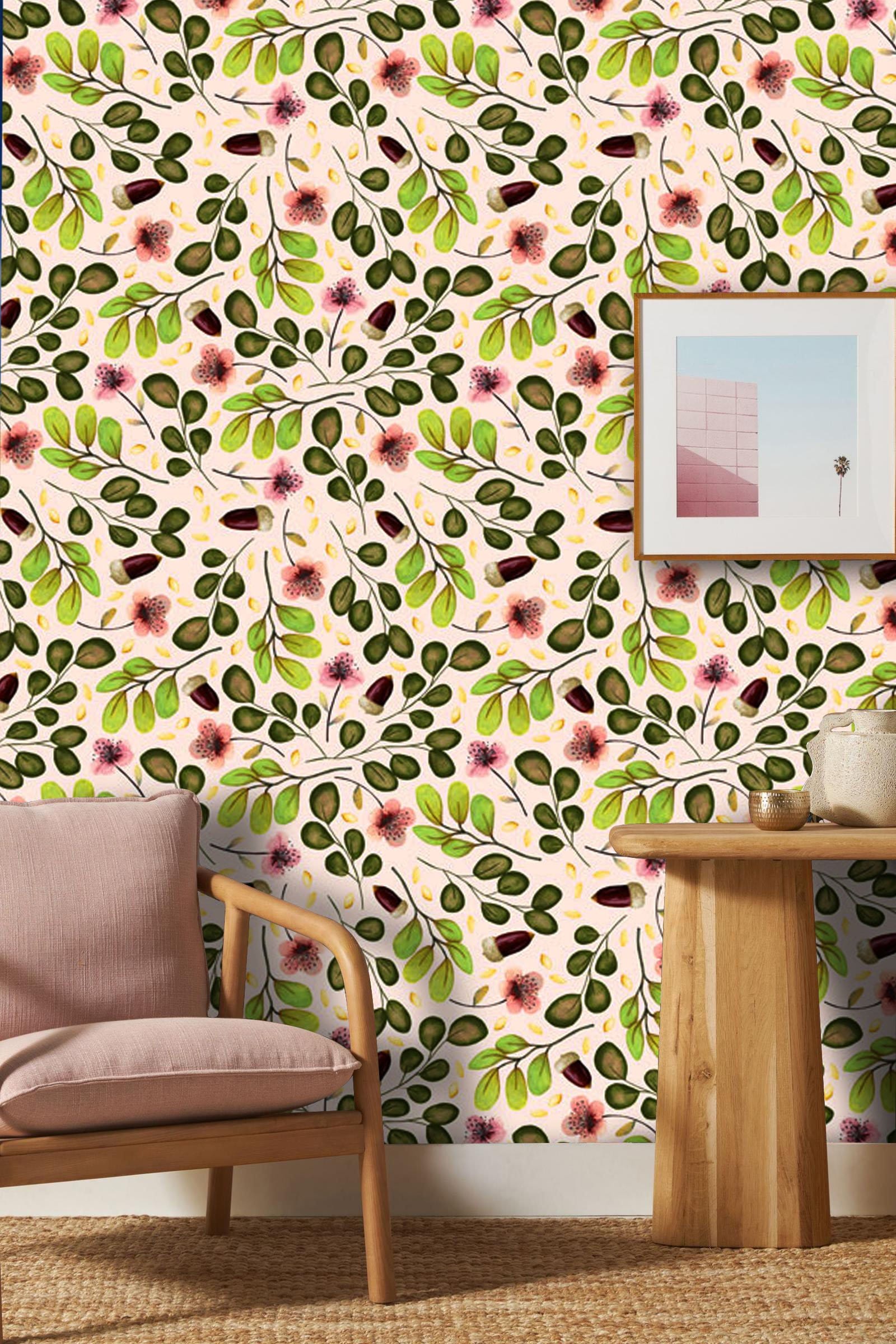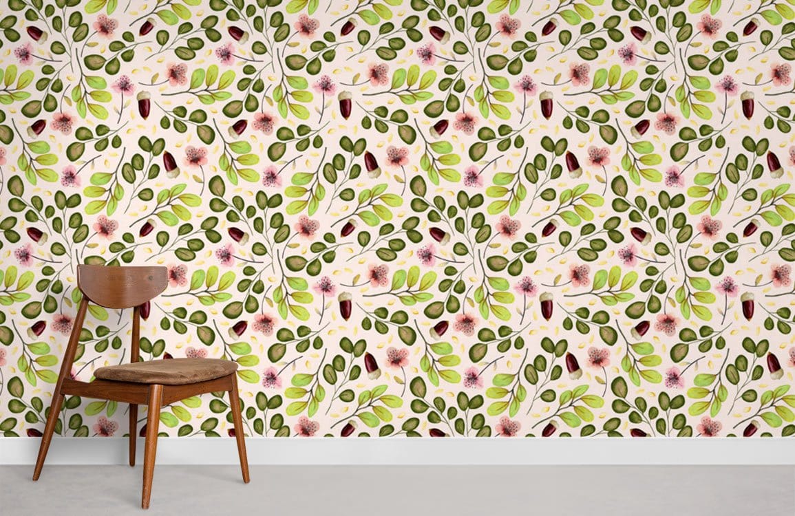Create a gorgeous space with our leaf and flower Wall Murals. This wall mural is designed with repeated pattern of small leaves and flowers in pastel pink background, which will bring a vintage yet fresh look to your space. Perfect wallpaper that works well with all your bedroom, living room, kitchen and dining hall.