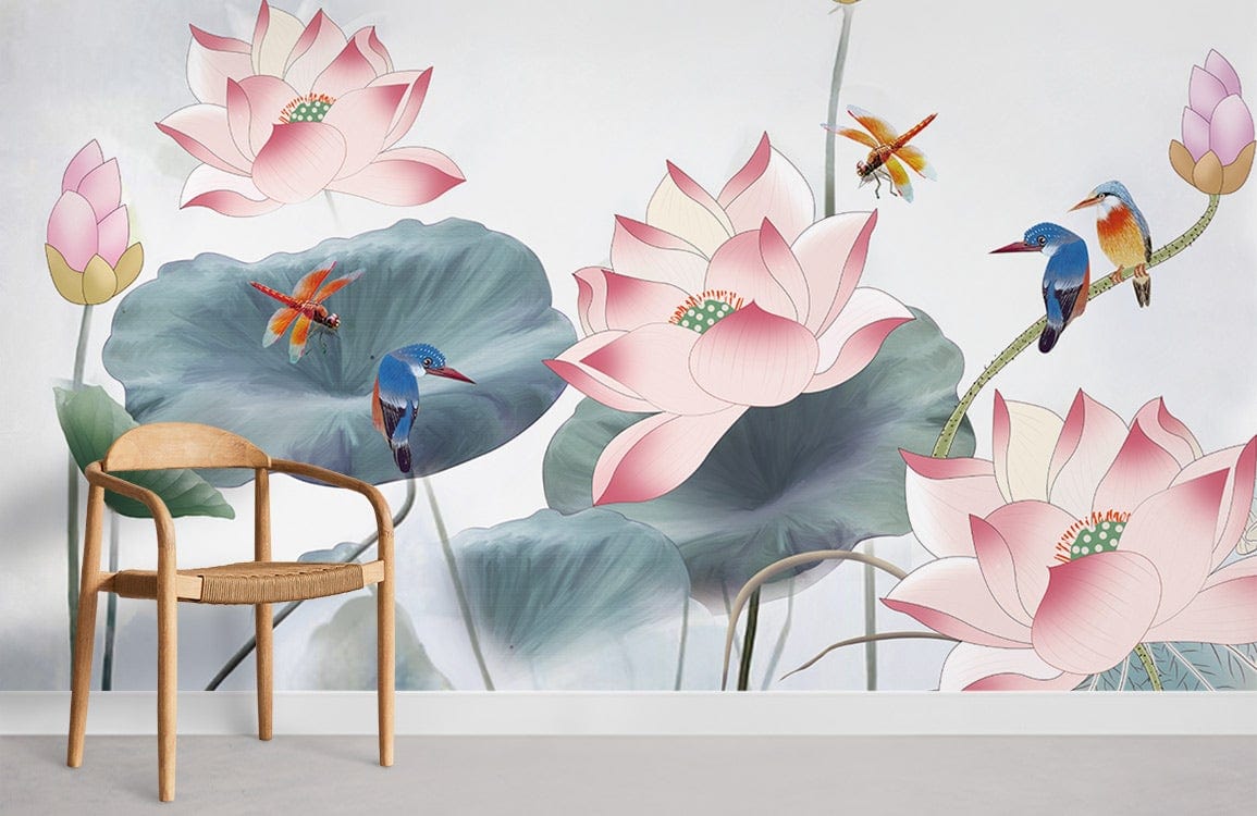 This Lotus & Dragonfly Wall Murals will give your walls a feeling of relaxation with the cool texture and smooth pattern. Combining a subtle and calming lotus design with colourful images of dragonflies flying around, this layout perfectly blends into its plain white background for the added floating and highlighting effect. This flower wallpaper is great for decoration in adults' rooms and teen bedrooms with modern, minimalist, and elegant themes.