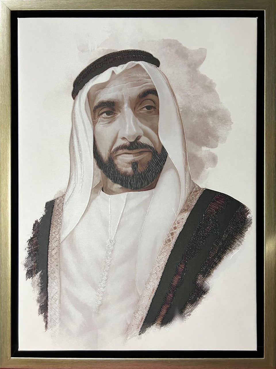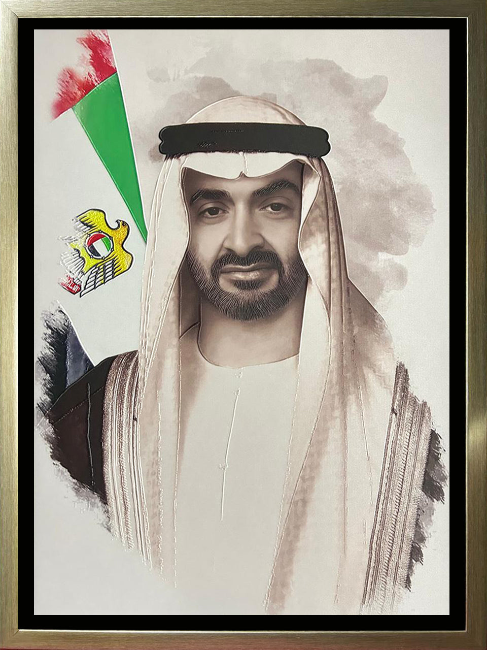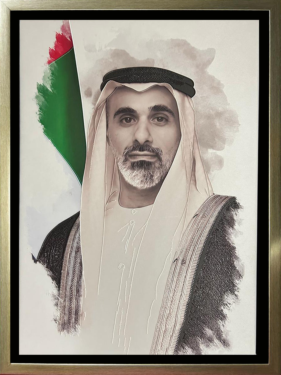 2. Textured Embossed Printing: Our advanced textured embossing technique adds depth and dimension, creating a lifelike portrayal of HH Shaikhs distinguished presence.