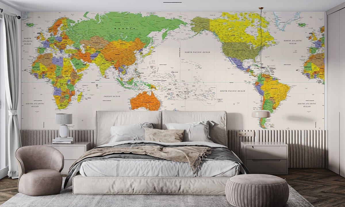 Know this world from A to Z with this custom-made map Wall Murals. This on-trend map of the world is a fantastic background for your rooms. All of the countries and regions have been clearly detailed in this map. Suitable for any places in your home office, bedroom and hallway.