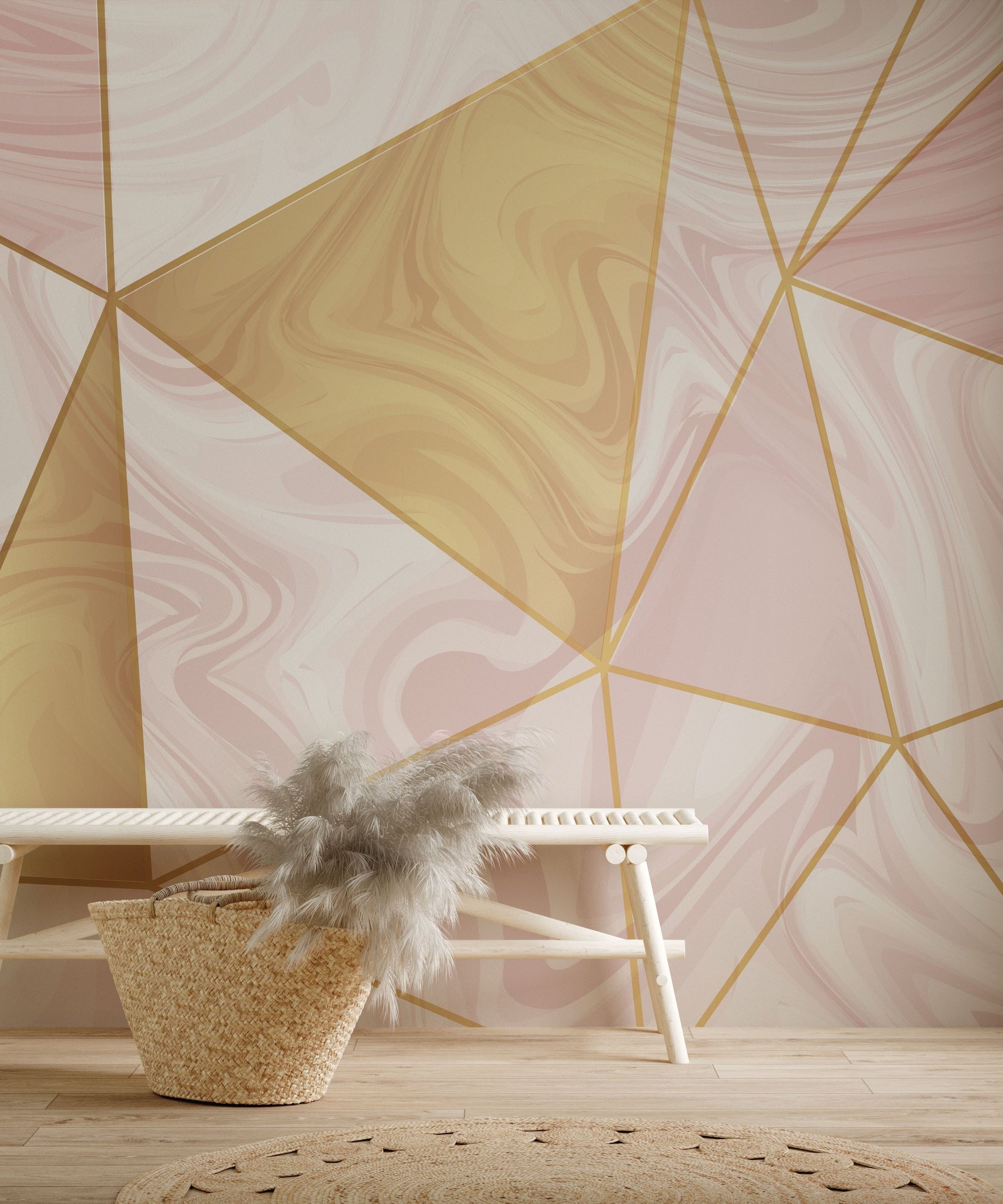 Add a simple grace with this pink geometric Wall Murals. This beautiful geometric pattern with three tones of pastel pink, pink and golden marble tile to transform your living space into a modern and stunning piece of art. Perfect wallpaper for living room, bedroom and home office.
