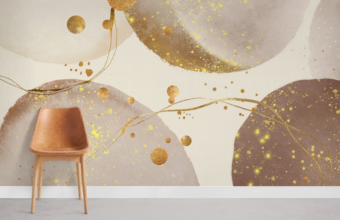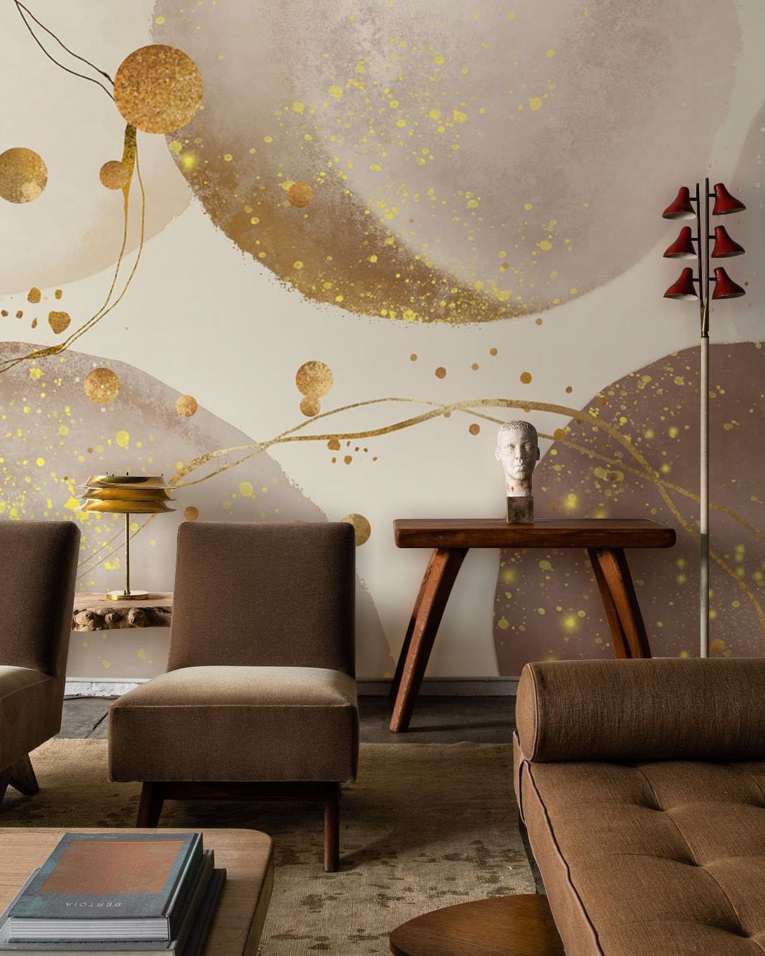 A simple design brings together abstract lines, abstract doodles, and creative patterns that is modern, colourful, and impactful. With ivory white background, golden rounds, lines & dots, the tones of this piece help bring the mural to life and create an ultra-modern feeling your space. Use this design with any decor in a bedroom, living room, dining room, and hallway.