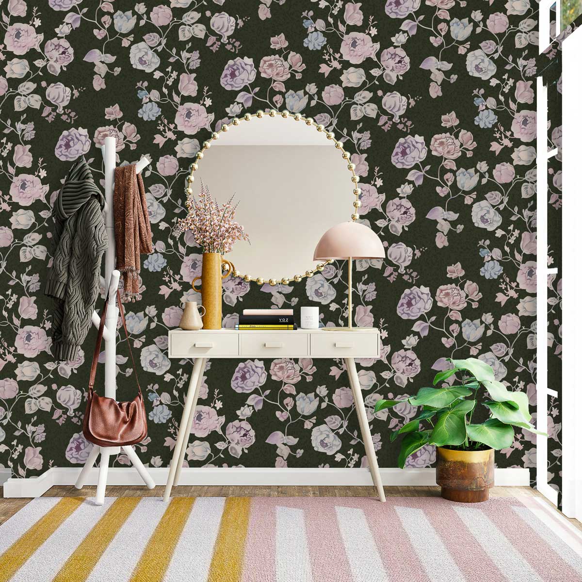 Beautify your home with this repeat flower pattern Wall Murals. This design in dark black background with pink flowers crawling across your walls will instantly add more freshness to your rooms. Pair it with traditional furniture and home decors for a charming look to your Interiors.