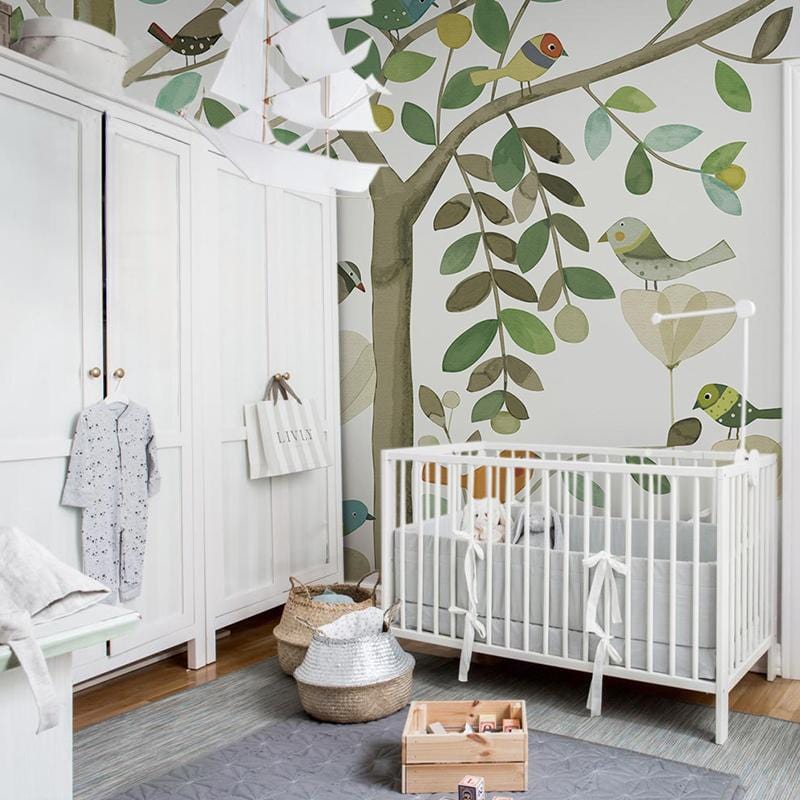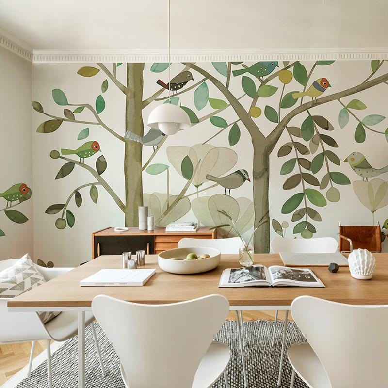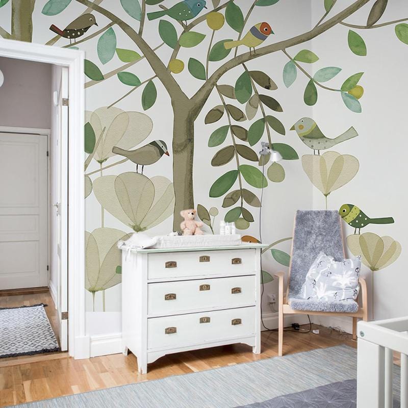 Decorate your room with this charming tree and leaf wallpaper. This pastel green painting in the pure white tone background significantly add more vitality and energy to your space and make you feel like living in spring forever. Transform your plain wall into this amazing wallpaper in your bedroom, living room, dining area and hallway and it will match with all kinds of furniture you choose.