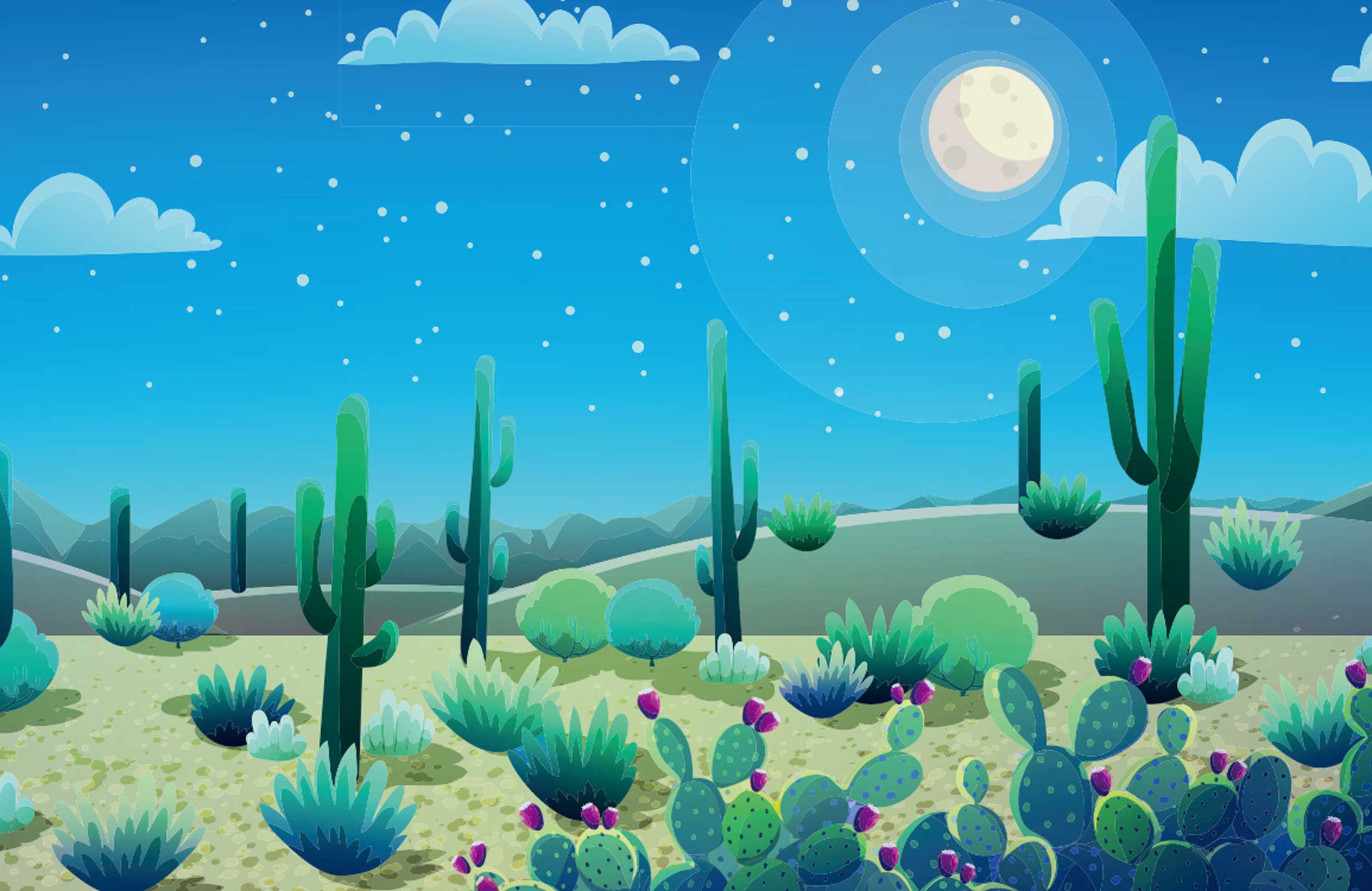 If you are bored with your bland walls and want to transform them into something eye-catching, then here it is! This cactus desert at night in moonlight and stars Wall Murals add dramatic effect to your room. The wall mural is painted with blue tone that define every corner of your home. This is an ideal wallpaper to install at your dining hall, lounge, bathroom, bedroom, and even your kids' room.