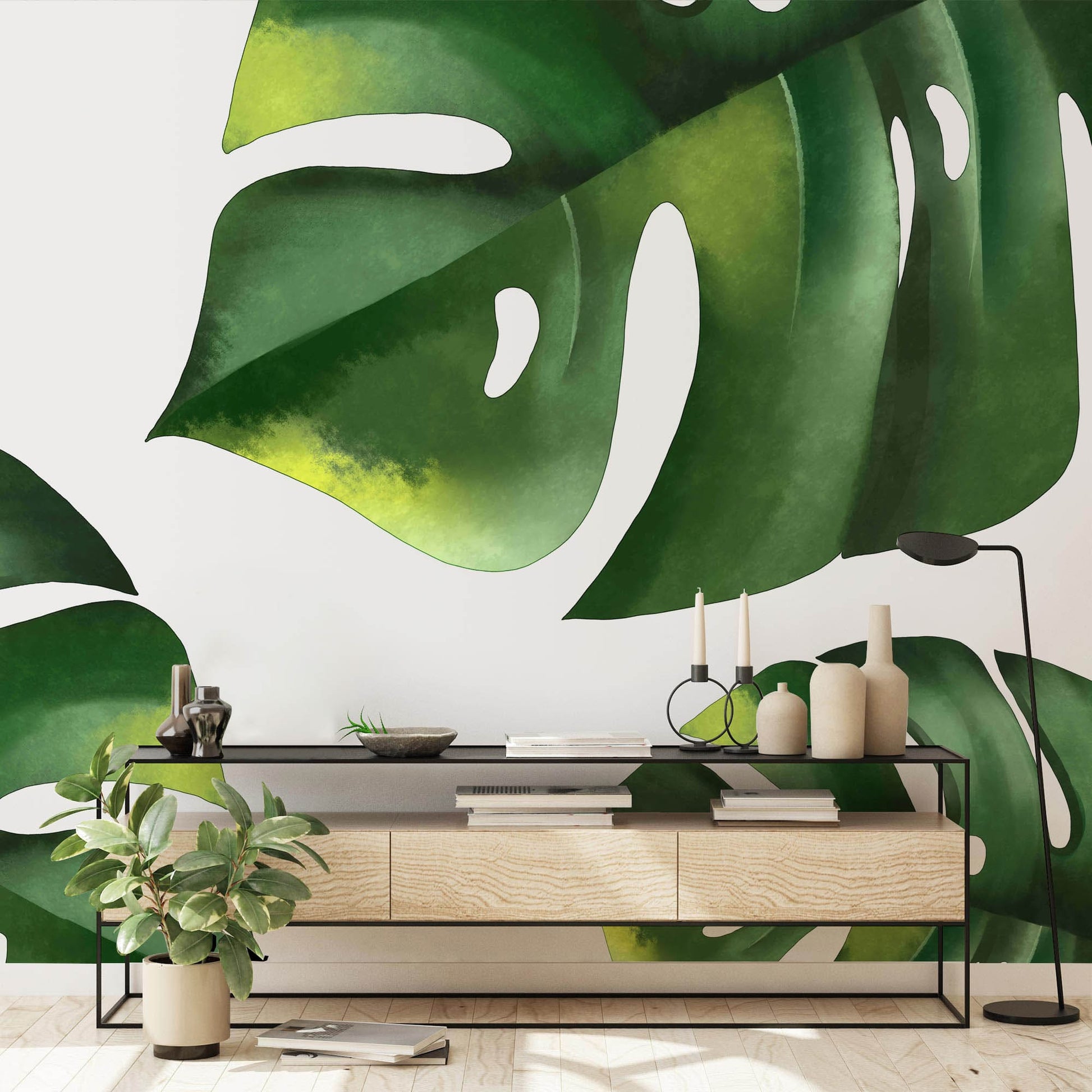 The design of our Photographic Monstera Wall Murals is simple yet will make a bold statement in your interior. Invite the calming effect of nature into your living room to create a relaxing atmosphere. The close-up, highly filtered photography of the faux plant creates an interesting, minimalist style for this larger than life botanical mural.