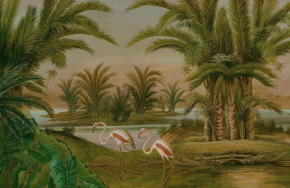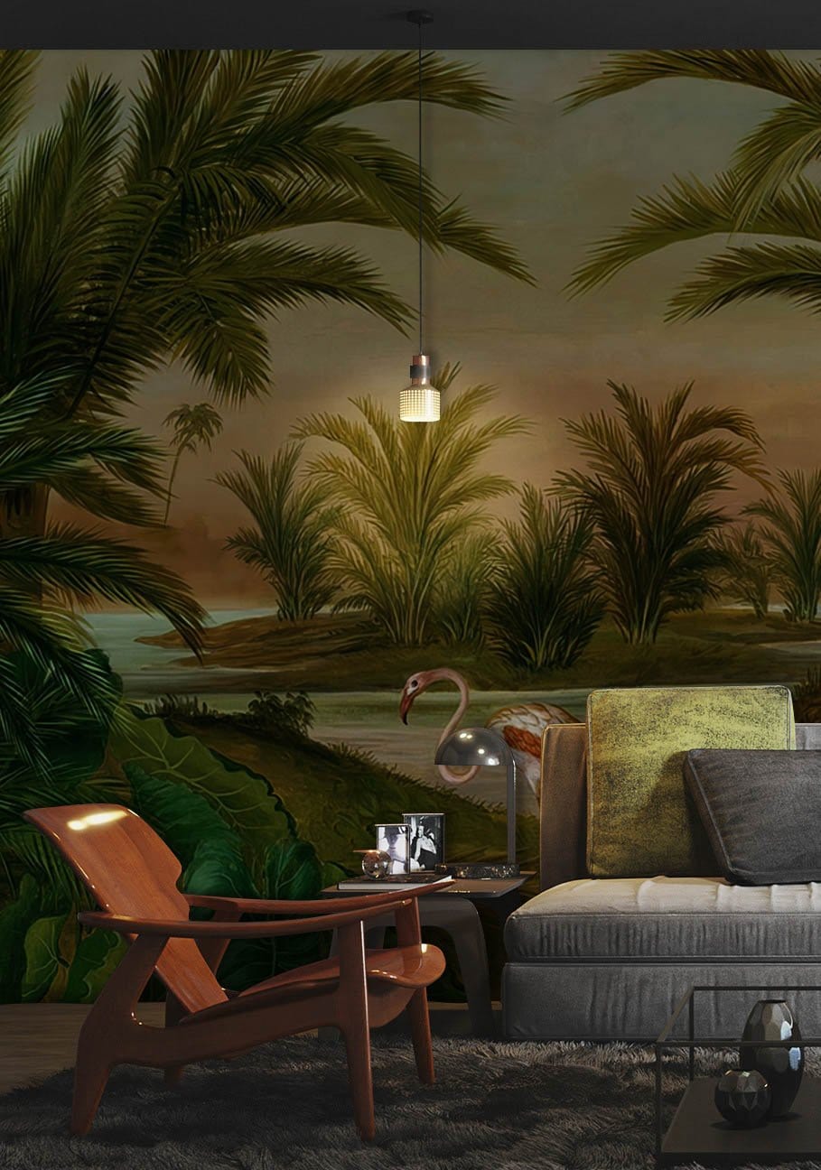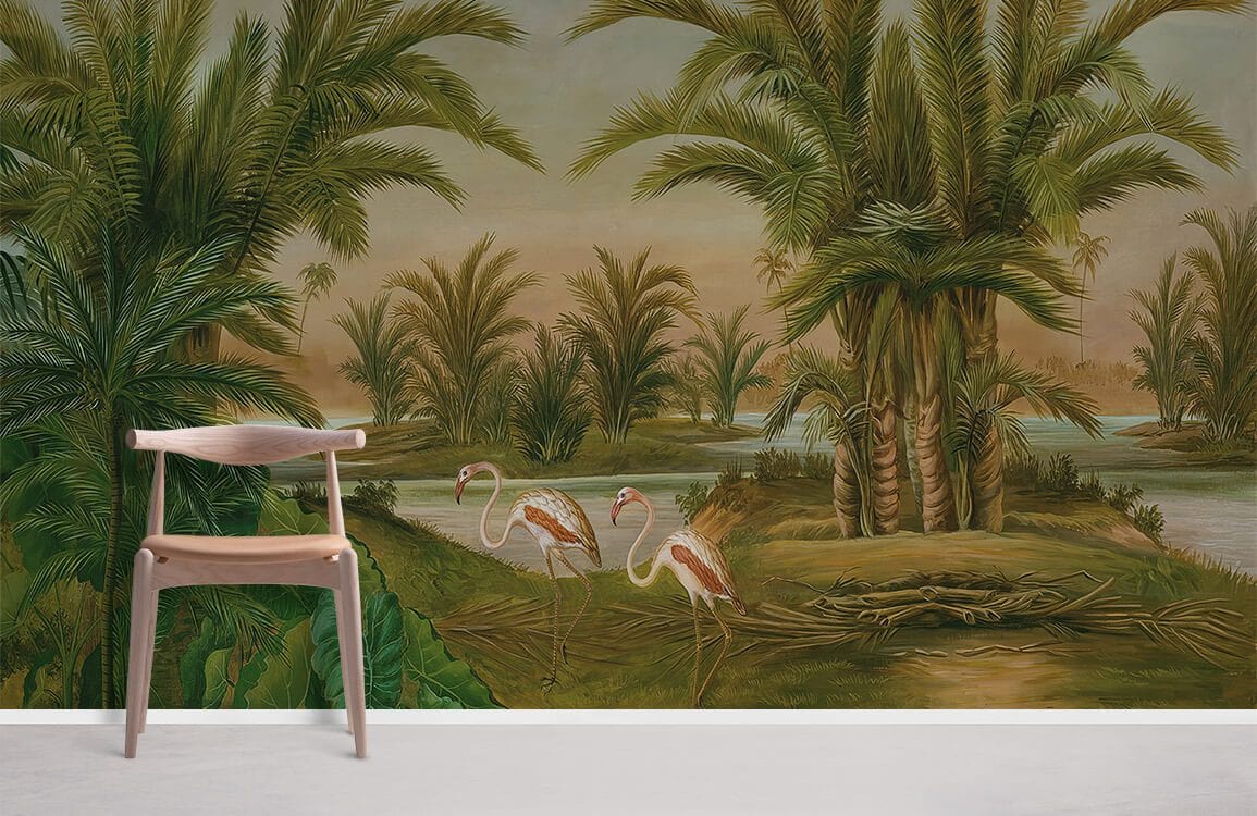 Escape into the tropical paradise with this attractive Wall Murals. This jungle-themed wall mural shows tropical palm trees with flamingos alongside that surely gives your room a fresh appeal. Ideal wallpaper for your living room, bedroom and dining hall. Pair it with modern furniture and home decors to feel the passion of tropical forest.