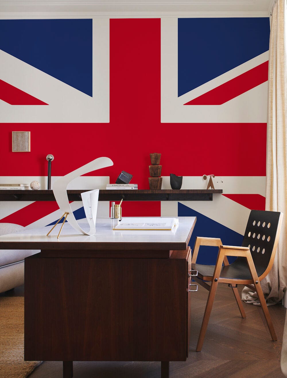 "Parade your patriotism on the inside, whether you live in the U.K., or are just a fan of the Union Jack. Our Union Jack flag mural wallpaper, with its pattern of the Union Jack Flag over a white background, is sure to be an eye-catching statement. Use it indoors or outdoors, and with repeat application, future changes are easy to implement. This mural is recommended for smooth flat surfaces and should not be sized horizontally. "